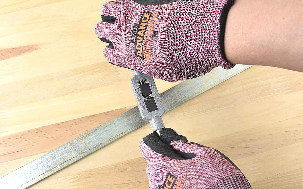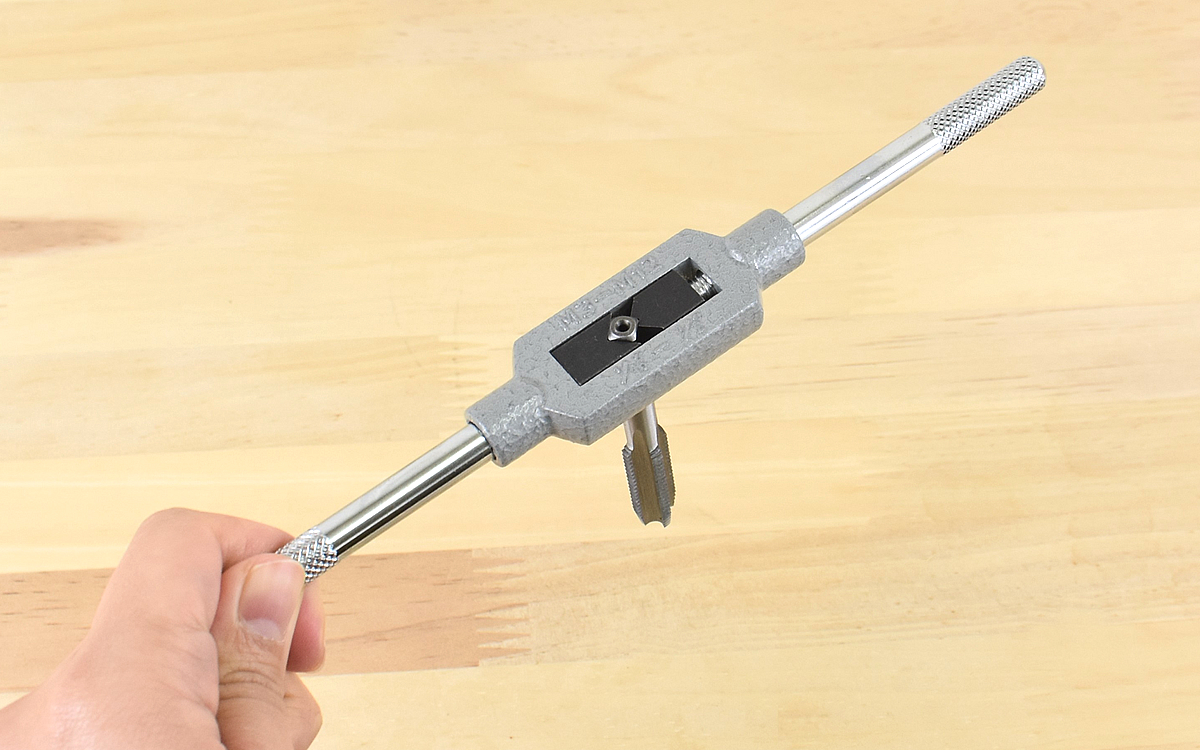 続いて穴を開けた鉄鋼材にタップをはめてハンドルを回転させれば、“めねじ”加工の出来上がり。