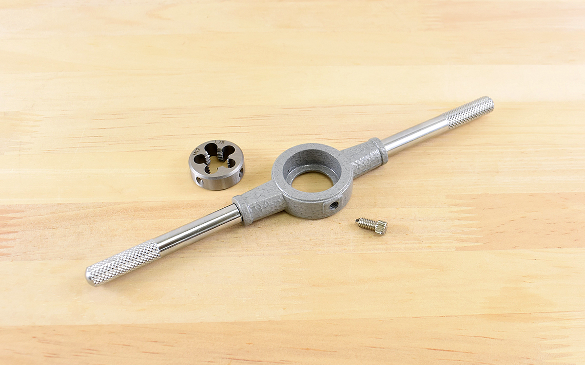 ダイスハンドルには元々ダイスが1つはまっています。別のサイズを使うときは、ハンドルの側面にあるネジをマイナスドライバーで開閉することで付け替え可能。後はダイスに工作物をセットして、水平にした状態で均等な力でハンドルを回せば“おねじ”を成形できます。