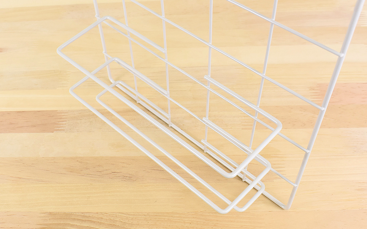 1番の特徴は鉄材フレームのみのシンプルな作り。3つのフレームのうち一番下の枠が底板の役割を果たします。ですので、上ふたつの枠より大きいものは入らず、一番下の枠より小さいものは落ちてしまうので収納の際には気をつけましょう。