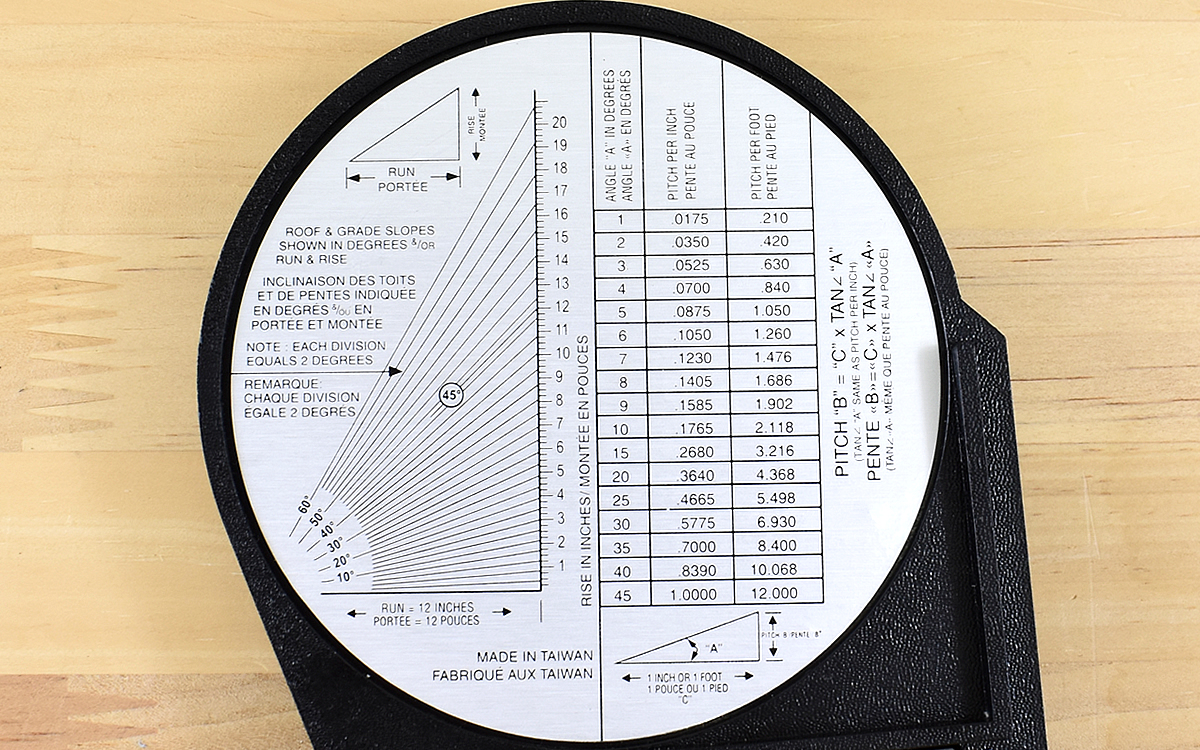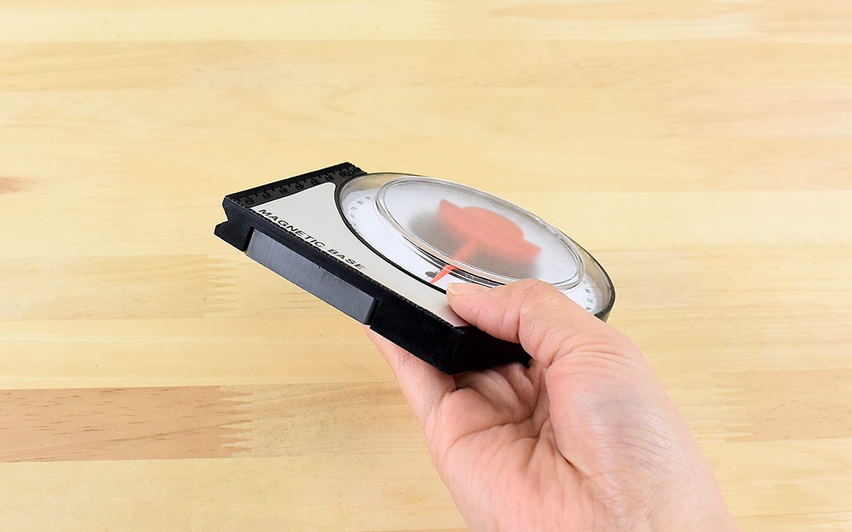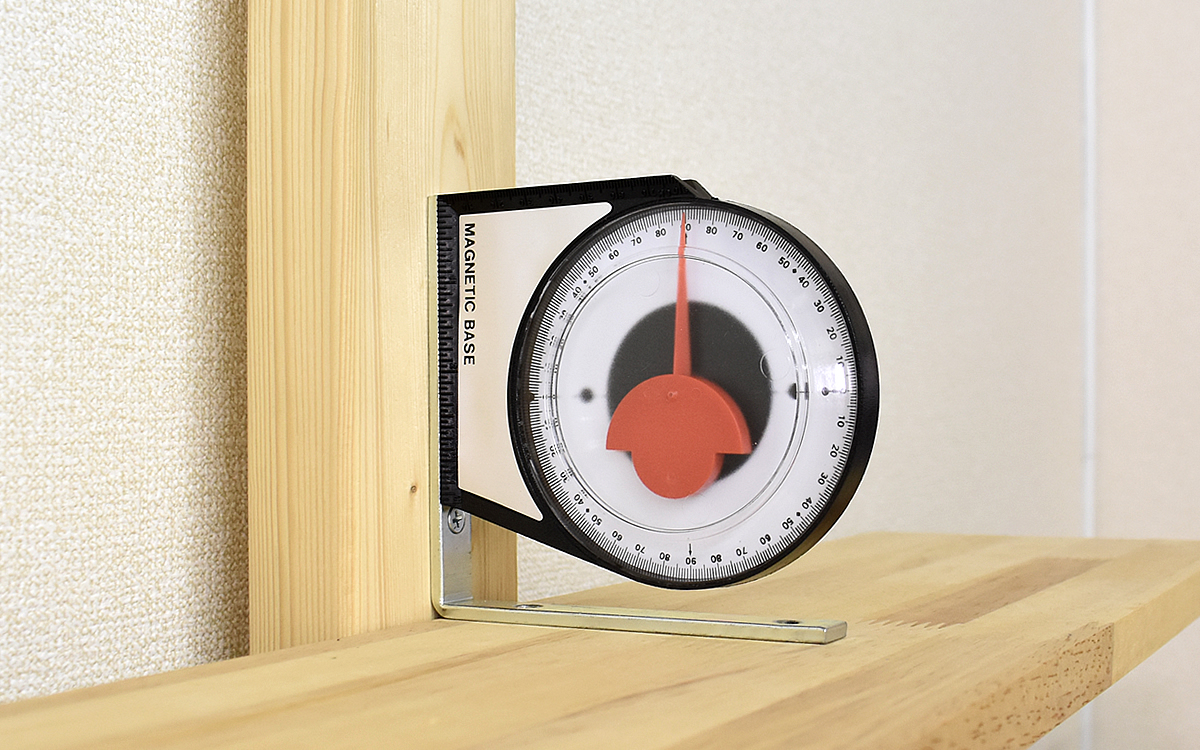 使い方はとても簡単で、角度を測りたい場所にアングルファインダーを置くだけでOK。置いた際に針が0度を指せばその場は平行とすぐに確認できます。針が止まるまで少し時間がかかりますが、気になるほどではありません。目盛りは0~90度で表記されており、シンプルな表記なので一目で角度を確認することができました。