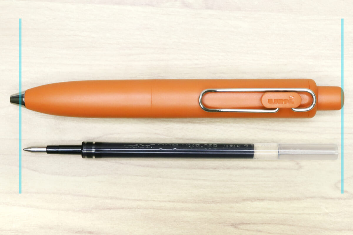 口金周辺やカラー、クリップなどの要素は同シリーズの「ユニボール ワン F」に近いが、とにかく寸詰まりで寸胴。印象としては、ユニボール ワン Fを前後からムギューッと押し潰したような感じなのだ。実際に数値で見ても全長約117mm/軸径約13.9mmということで、ユニボール ワン Fの全長約140mm/軸径約11mmと比べると、やはり「豆タンク」と表現せざるを得ないだろう。