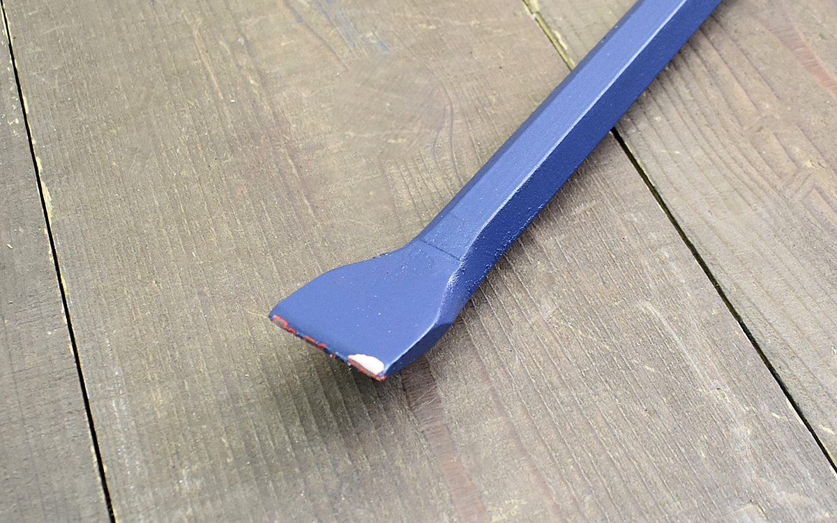 先端部分は尖っており、重量を考えると壁などに一撃で突き刺さりそう。主に対象物に引っかける部分はへらのようになっていました。使い方としては、対象物に潜り込ませて使う方法が一般的。比較的へら部分は薄いので隙間に潜り込ませやすくなっています。炭素鋼製で作られているため、薄いからといって簡単に折れたりはしない点もGOODポイントです。