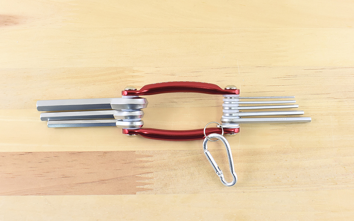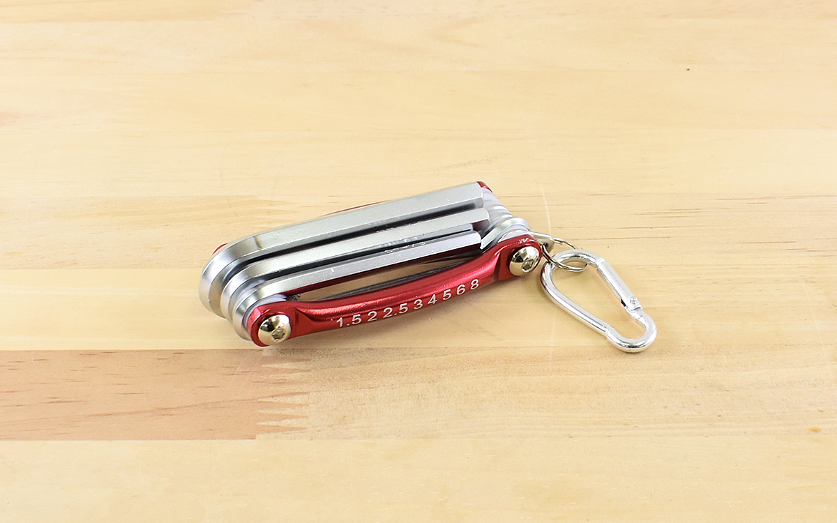 「六角レンチセット」は携帯にも便利な軽量アルミボディのハンドツール。十徳ナイフのように六角レンチを折りたたんで収納できます。サイズは折りたたんだ状態でおよそ9.1cm(全長)。ポケットにも入る大きさです。六角レンチのサイズは1.5、2、2.5、3、4、5、6、8の全8種類。8mmサイズの六角レンチもあるため、手にするとしっかりとした重みを感じました。