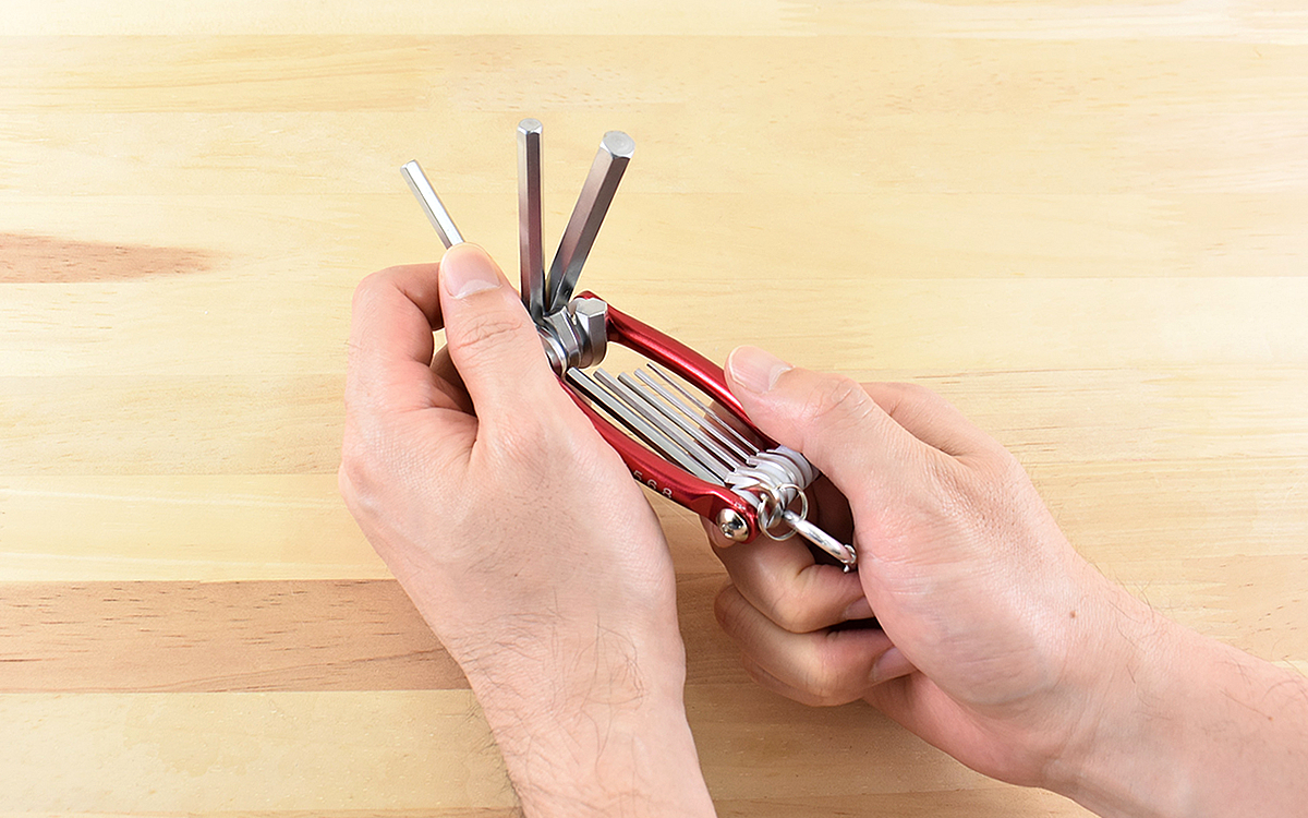 さっそく使ってみました。1番のオススメポイントはグリップに対して垂直や直角など、向きを自由にアレンジできること。各六角レンチには使用の際のストッパーは特にありません。そのため最初、回している最中に若干の不安定さを感じる気がしました。しかし固定されていない分、使用時の状況に合わせて好きな角度に調整可能。結果的にこちらの方が使いやすいのではないでしょうか。