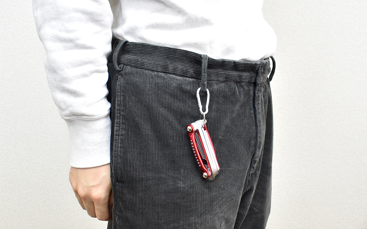 また、カラビナが付いているので携帯も便利。六角レンチが8本も付いているのにコンパクトなので、ズボンのベルトループに引っ掛けて持ち運べます。家だけでなく、車やバイクに積んでおいてもいざという時に役立ちそうですね。