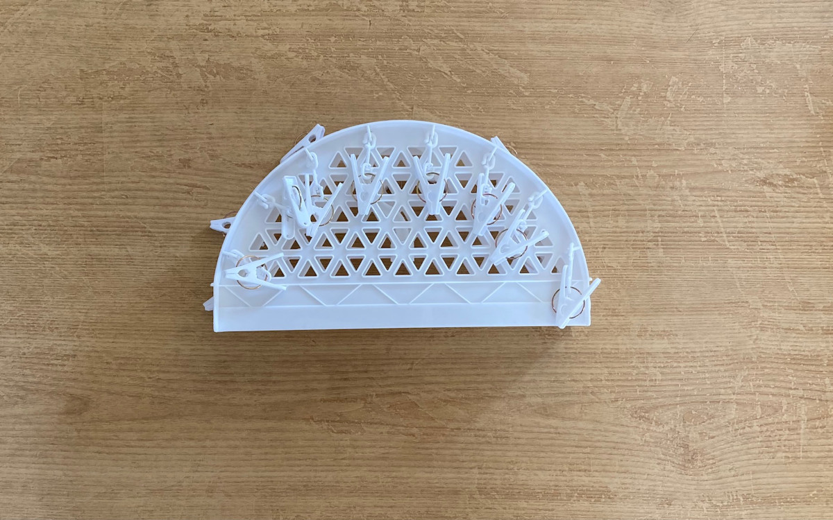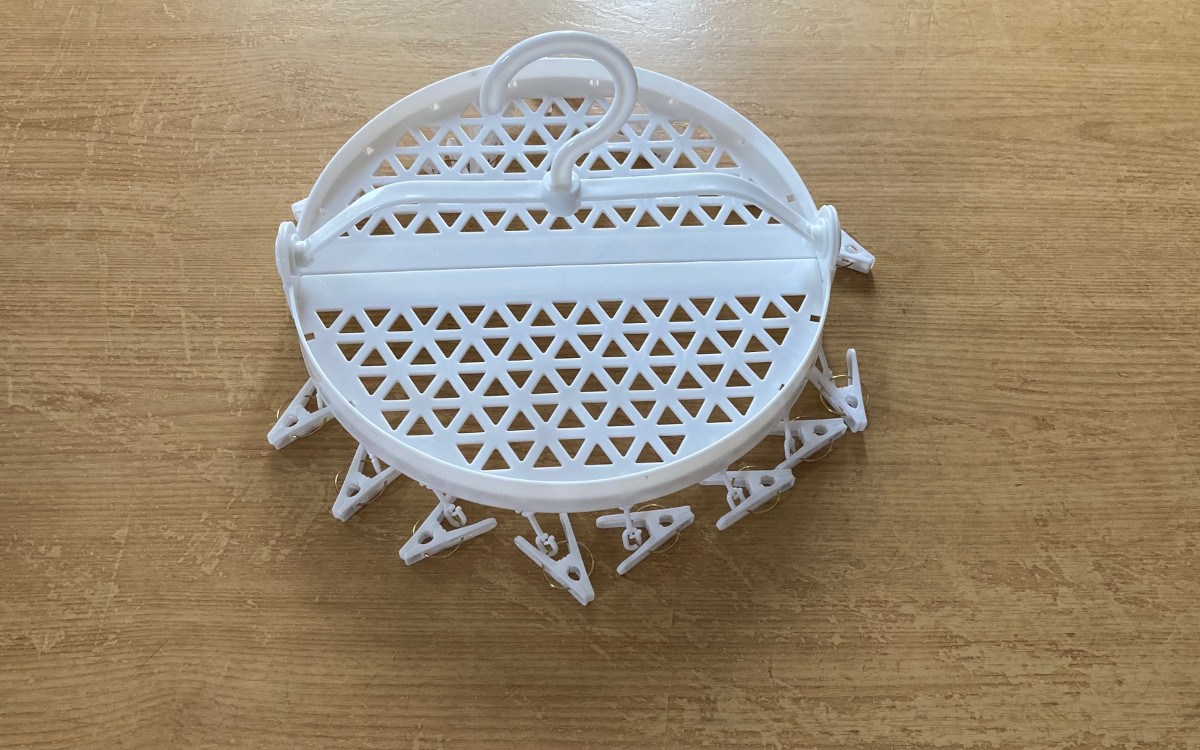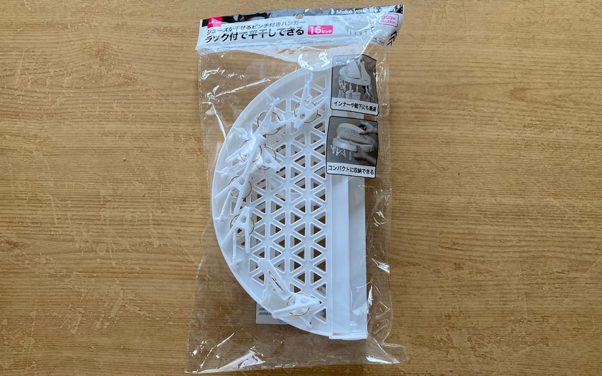 子どもが多いと、シューズをまとめて洗った際に干す場所がなくて困ってしまいますよね。たまたまダイソーへ買い物へ行ったとき、そんな悩みを解決できそうな便利グッズを発見! それが「シューズが干せるピンチ付ハンガー(16ピンチ)」(330円/税込)です。