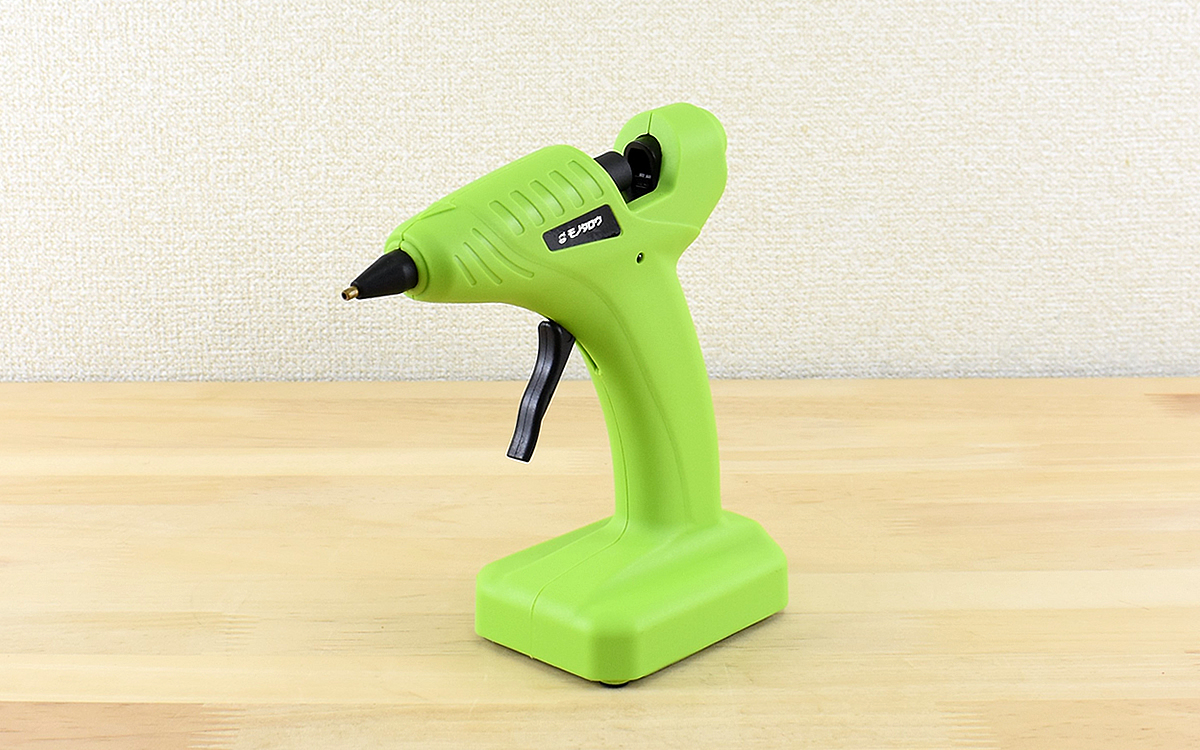 グルーガンは棒状の樹脂(グルースティック)を溶かして接着する道具で、木材や紙、皮革、布地などに使用できます。接着剤としてはもちろん、飾り物の造形やフェルト作りなど、様々なシーンで活用が可能。最近注目を集めており、SNSで取り上げられることも多いのでご存じの方も多いのではないでしょうか。今回は屋外でも使える「グルーガン コードレス 電池式」(989円/税込)を購入してみました。