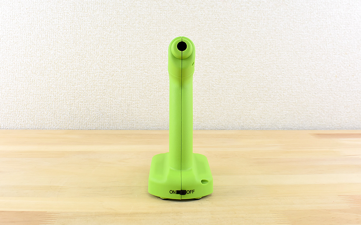 商品サイズは約155(高さ)×65(奥行)×165mm(幅)。鮮やかなグリーンがポップで可愛いですよね。電池は単3アルカリ乾電池1.5Vを4本使用しますが、別売りなので用意が必要。電源スイッチは底部に配置されているので、間違って押してしまう心配がないので安心です。