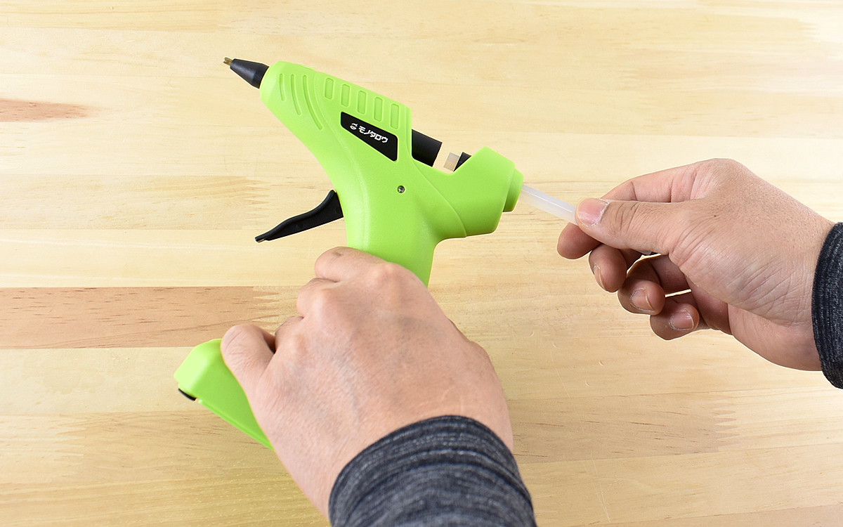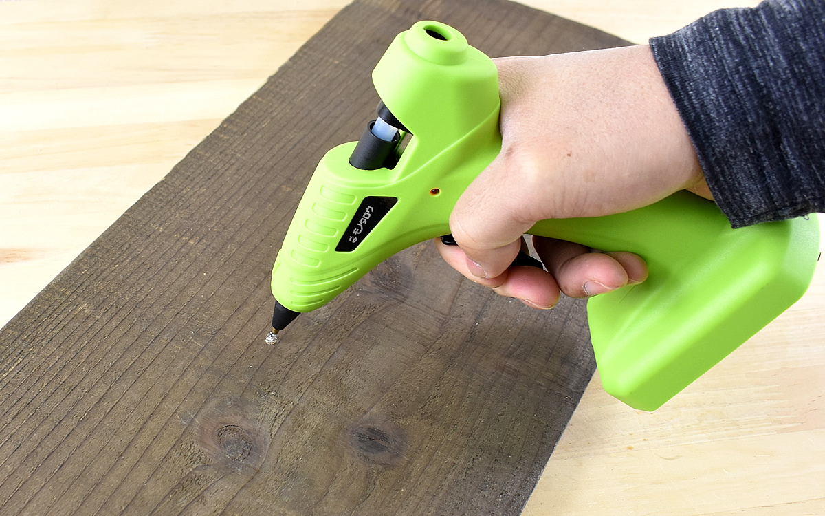 実際に木材に使ってみたところ、トリガーが波打った形状なので指を添えやすく、それほど力を入れなくても自然にグルーが出てきました。コードレスなので電源を必要とせず、電池さえあればどこでもすぐに使用できるので非常に便利です。