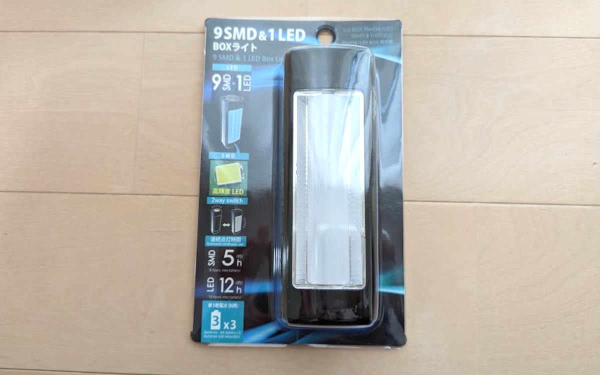 地震や水害によって突然停電になることはありますよね。普段はそれほど使用頻度が高くない懐中電灯ですが、いざという時にはなくてはならないもの。暗い廊下を移動する時には持ちながら照らして、部屋にいる時は置いたまま部屋全体を明るくしたい…。今回紹介する「9SMD&1LEDBOXライト」(110円/税込)は、そんな希望を叶えてくれる商品でした。