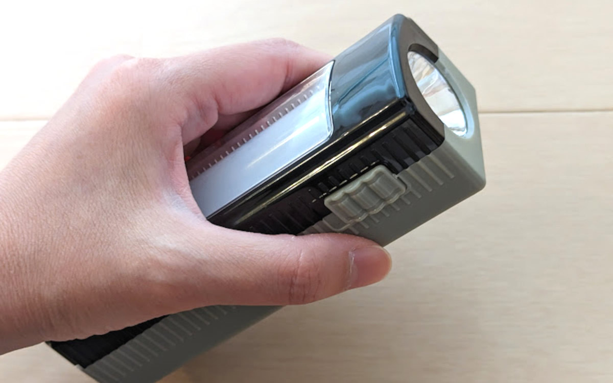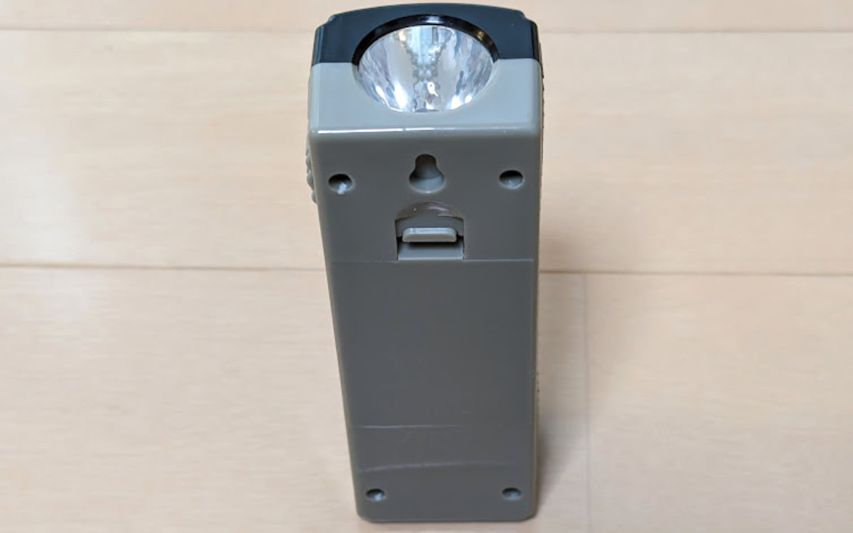 裏面上部には、引っかけられるようなくぼみが用意されていました。壁や収納扉の裏にフックを付けて引っかけておけば、停電などの緊急時にもサッと取り出せて便利ですね。