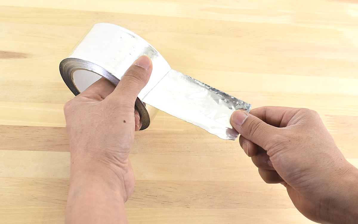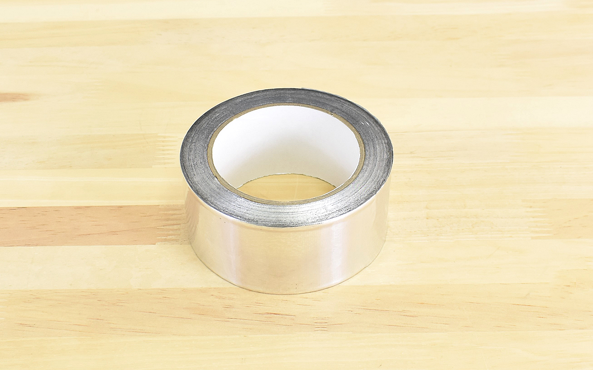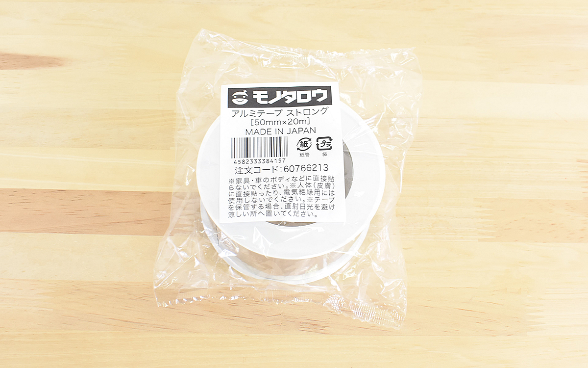 同商品はアルミホイルをテープ状にしたような見た目で、アルミ箔とPEフィルムが使われています。大きさはテープ幅が約50mm、厚さ約0.2mm。テープの長さは約20mのワンサイズ展開です。