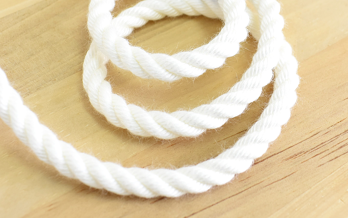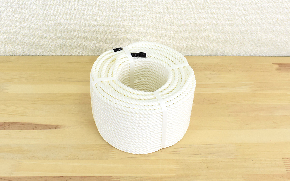 カラー表記は白とされていますが、実物はクリーム色寄りの白といったところ。今回購入したのは太さは6mmですが、他に9・12・14・16mmも選べます。レジャー用のテントロープやブランコロープ、または作業用の固定ロープなど、用途に合わせて太さを選べるのがいいですね。ちなみにどの太さを選んでも長さは同じ50mとなっています。