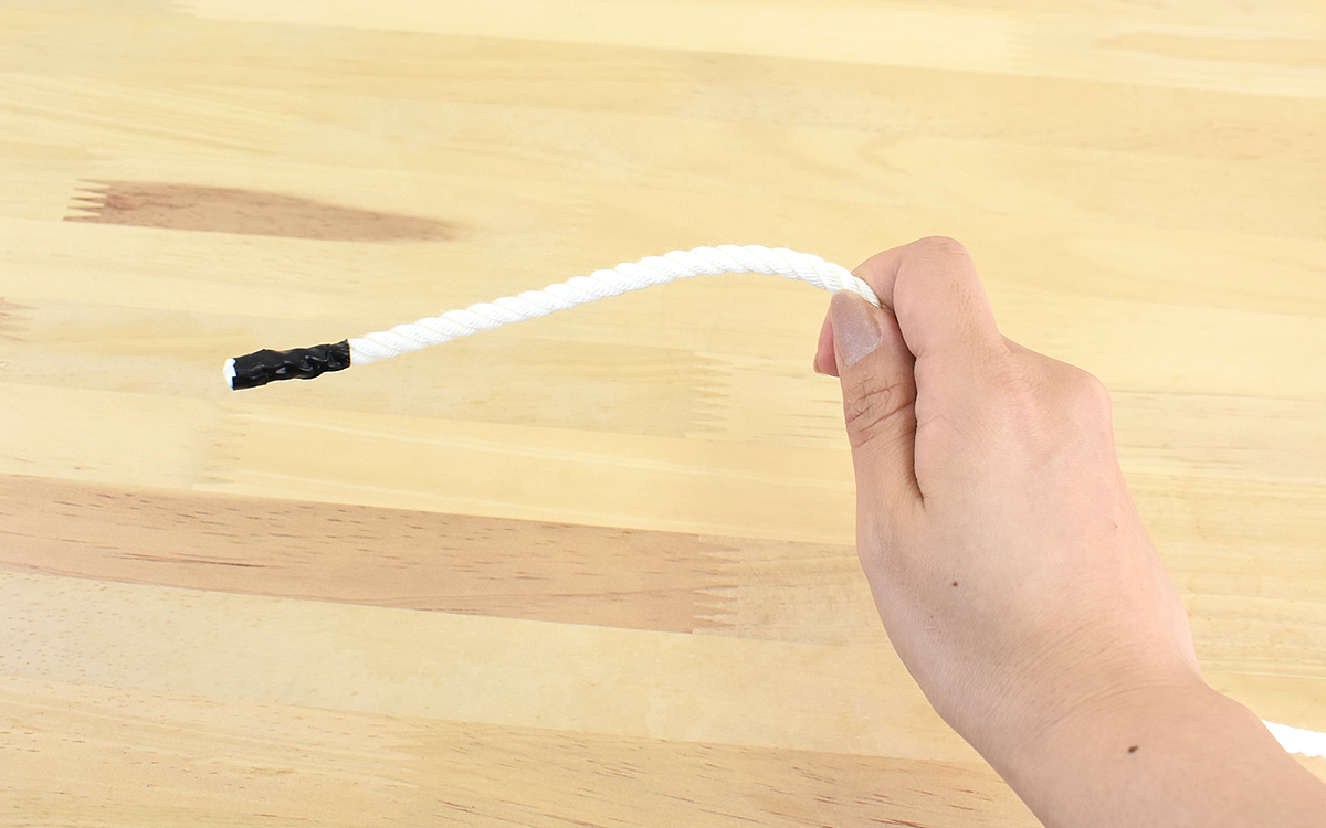 ロープの両端には、3つ打ちがほつれないようにビニールテープが巻いてあります。ロープを触ってみた印象は頑丈で繊細な手ざわり。ただトラロープよりは柔軟性があり、扱いやすさを感じました。ロープはとぐろを巻いた状態でビニールバンドで留められているため、外さない限り絡まってしまうこともなさそうです。