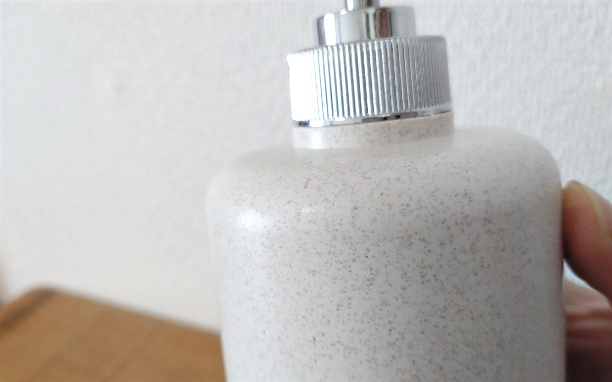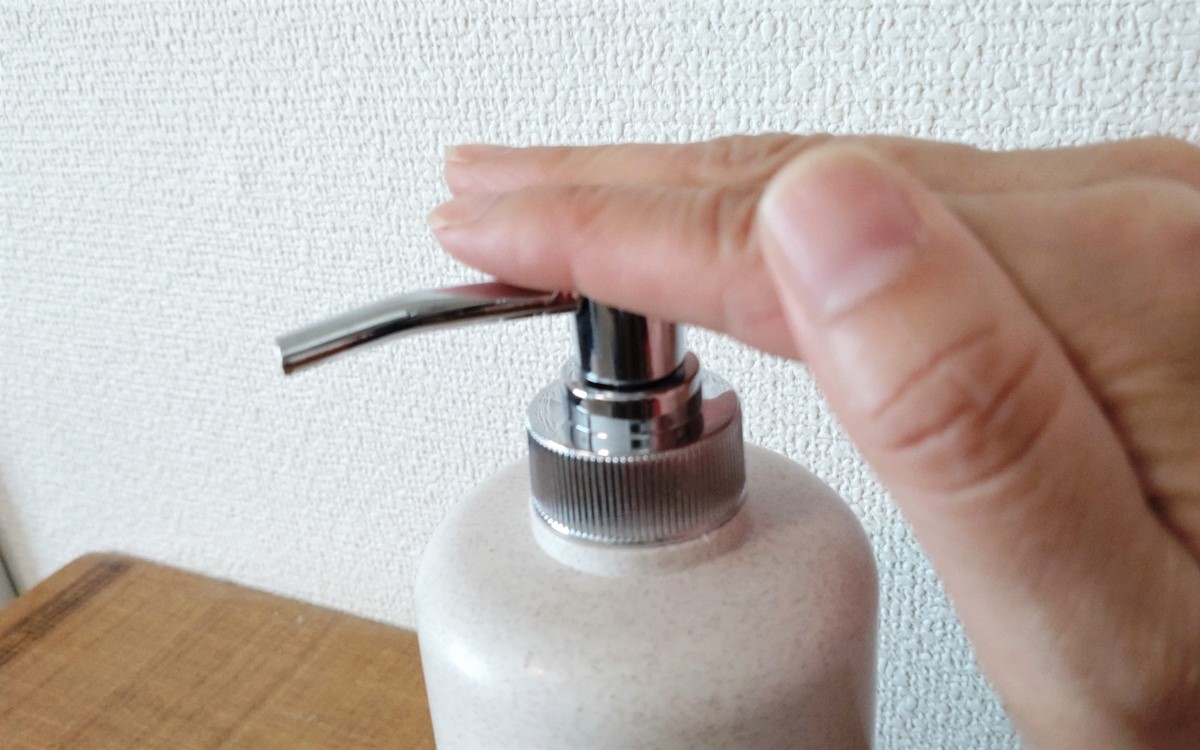 ポンプの押し心地も硬すぎず、かといって頼りないこともなく丁度いい強さで押し込めます。力の弱い子供や非力な人が指で押すのは少し大変ですが、手のひらで押せば大丈夫。容器の安定性が良いので、手のひらで押しても倒れる心配はありません。