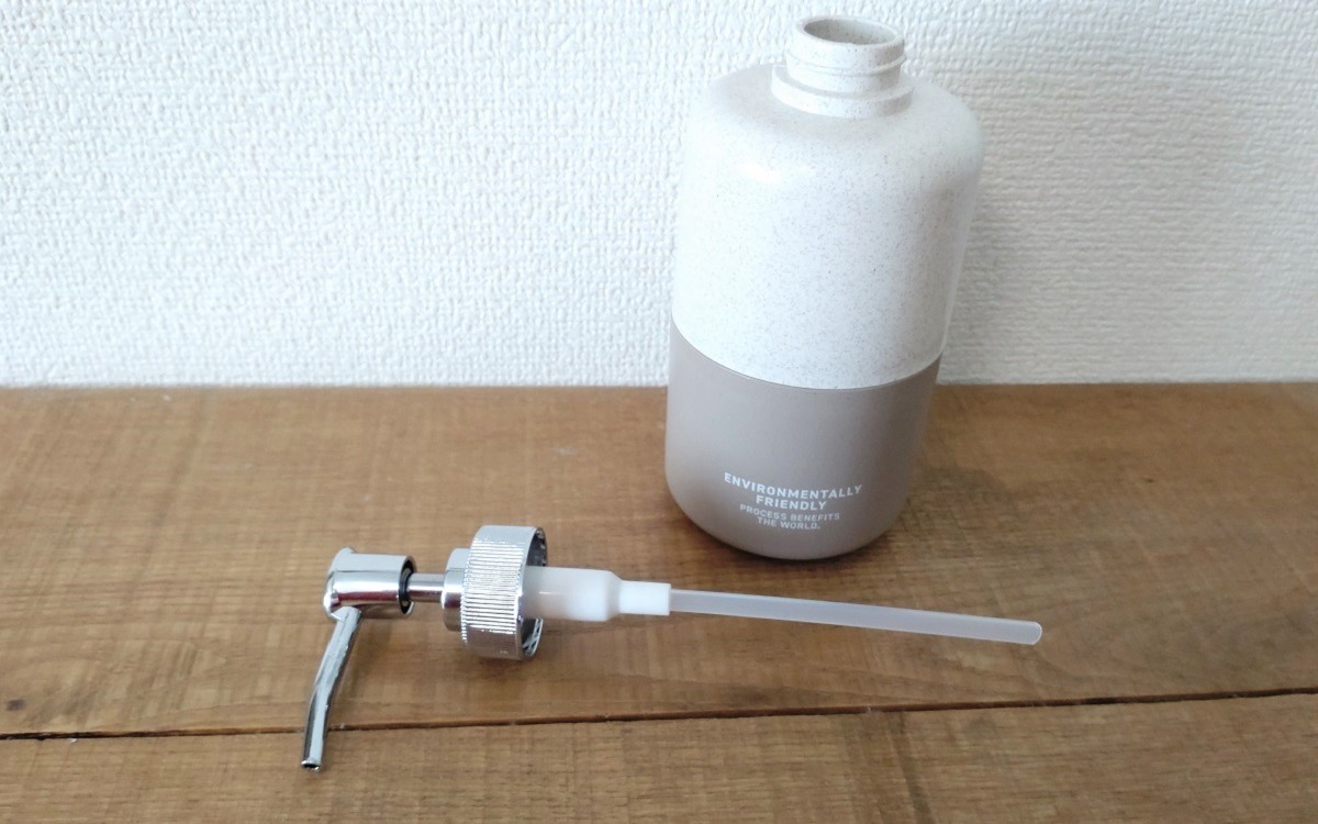 本体はシンプルな円筒形。高さ約16.7×直径約7cm、内容量は350mlとディスペンサーとしては一般的な大きさですね。液体洗剤を詰め替えるときは、ポンプを外して口の部分から入れていきます。ポンプを外してみて思ったのは、ハンドソープを吸い上げるチューブが思ったより長いということ。まれにチューブが短くて最後の方まで吸い上げられないものがありますが、この商品は底面近くまでチューブが届くのでその心配はなさそう。