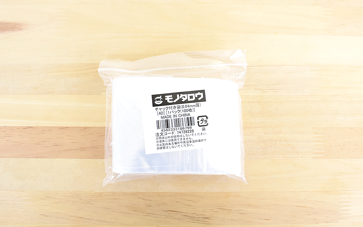 仕事や趣味で細かいパーツを扱ったり、品物を種類別に収納しなければならなかったりと、整理方法に困ることは多々ありますよね。そんなときに活躍すること間違いなしなのが、モノタロウの「チャック付き袋 厚み0.04mm」(263円/税込)です。