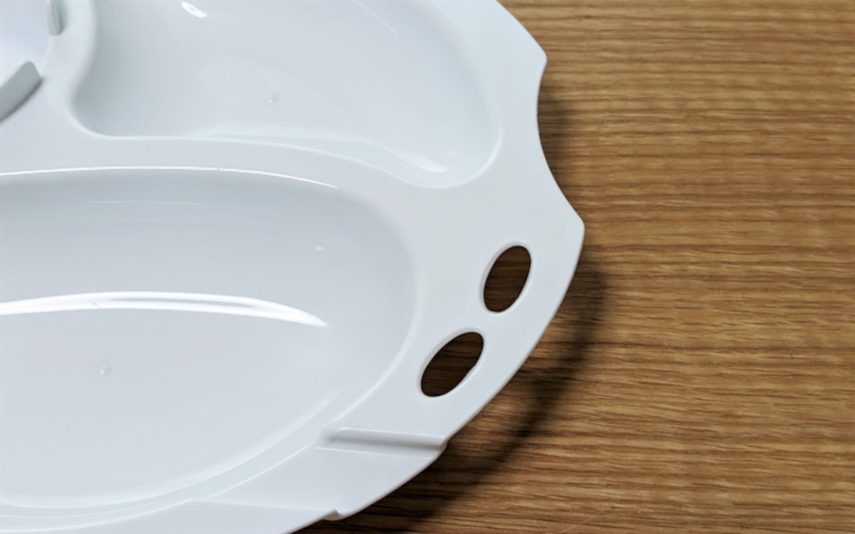 大きいスペースの縁をよく見ると、左右に“くぼみ”がありました。箸を置いて片手をフリーにできるので、飲み物を飲んだり焼き物の様子を見たりする時に便利です。