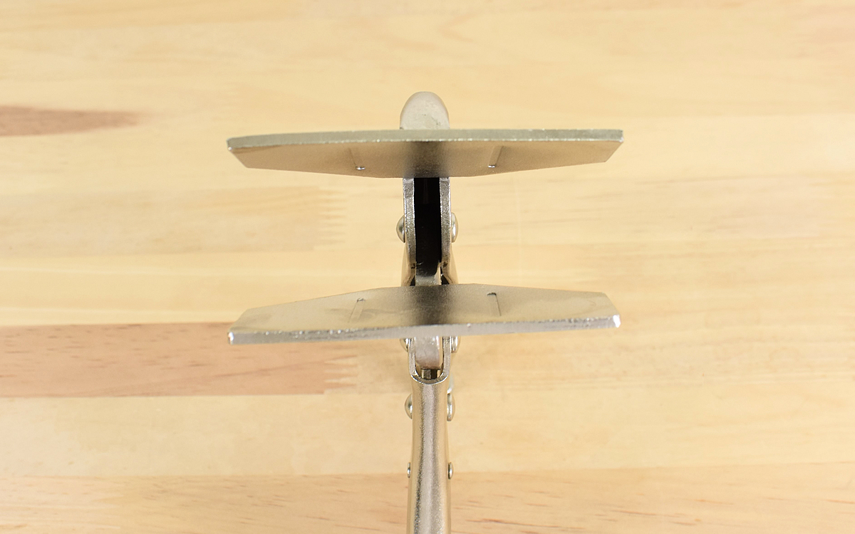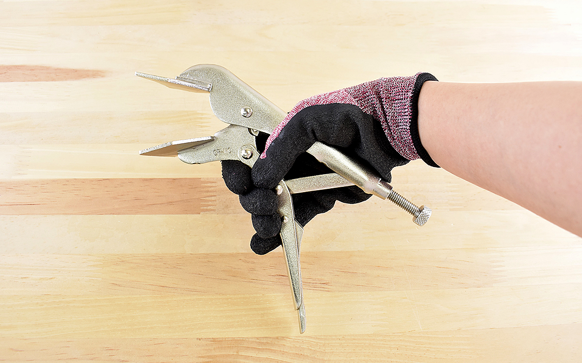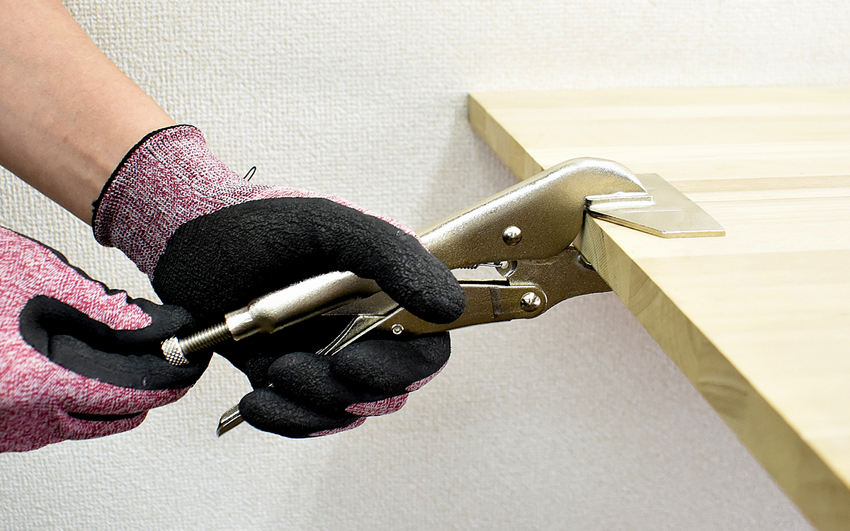 それでは板を用意してバイスプライヤーを使用してみましょう。最初に本体から飛び出している「調整ネジ」を回して、板を挟めるように開口幅を調整します。同商品は対象物を挟んで強く握るとロックが掛かる構造なので、握った直後にバイスプライヤーが開口しなければ固定成功です。ロックがかからない場合は改めて調整ネジで調整を。