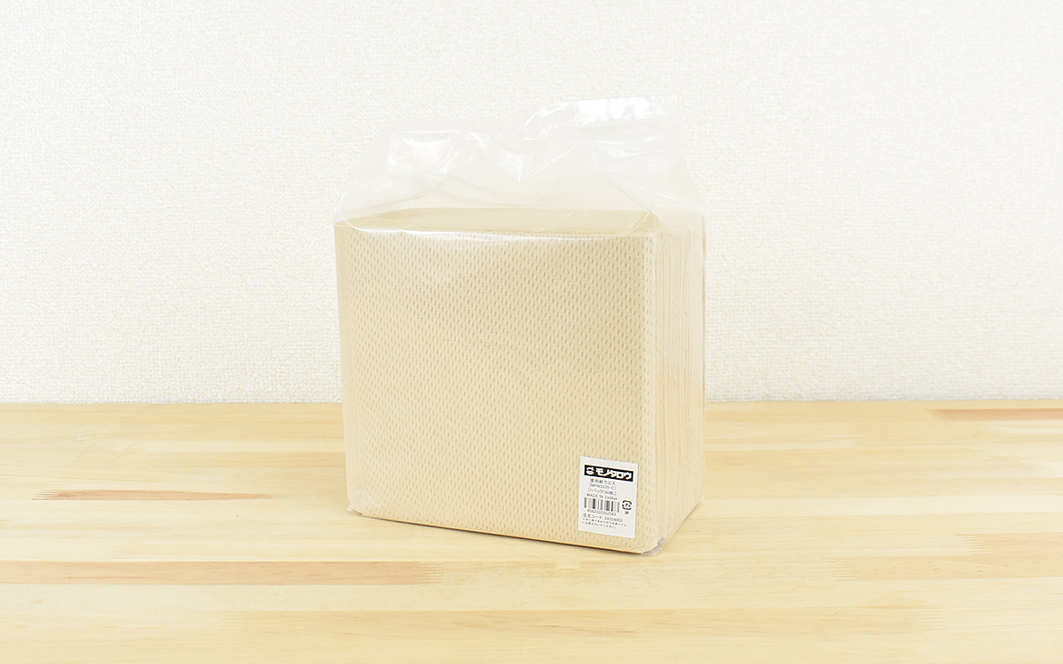 商品ページによるとパルプ100%よりも強度は落ちると記載されており、少し毛羽立ちやすさもあるものの油汚れなどの拭き取りにはまったく問題なし。1枚あたり4.6円(税込)と安価なので、消耗品と考えて気兼ねなく使えるのもいいところです。