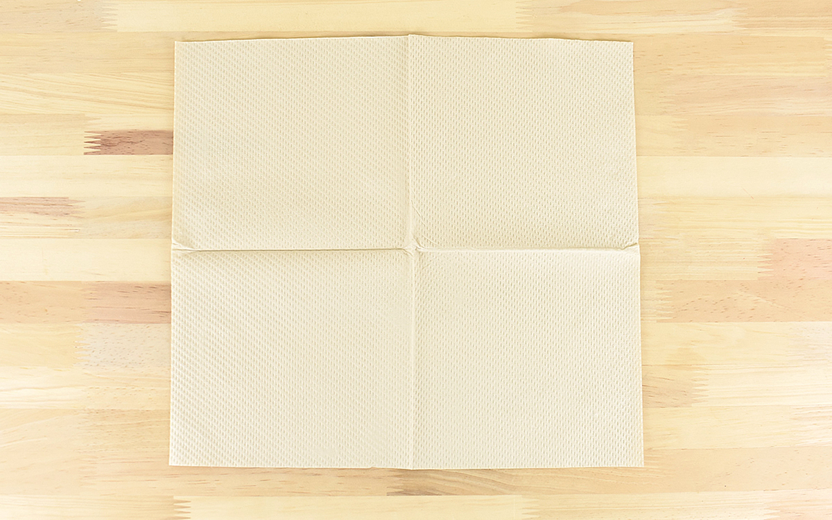 今回は1パック(50枚入り)で購入しましたが、専用ケースはなくビニールに入った状態で手元に届きました。なお1箱(50枚×24束)でも4829円(税込)で購入が可能です。紙ウエスは四つ折りになっており、拡げたときのサイズは330(タテ)×350mm(ヨコ)。サイズ的には十分な大きさだと感じました。
