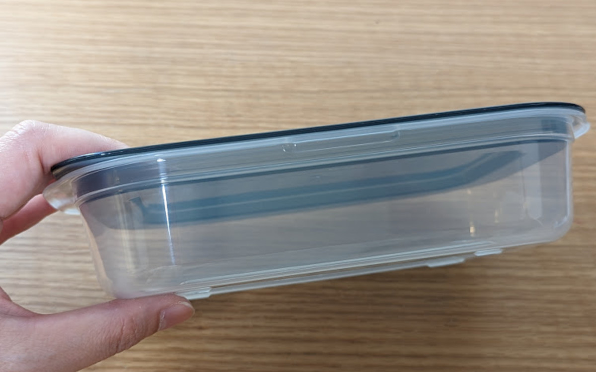 作り置きのおかずや下ごしらえした食品を入れておくのに便利なプラスチック製の保存容器。わが家でも重宝しているのですが、洗う際にフタの溝の部分が洗いにくいためしっかり洗えているか気になっていました。工夫して洗っているものの、正直なところ毎回の作業が面倒…。そんな悩みを吹き飛ばしてくれるのが、今回ご紹介する「楽ちんパック浅型550mlクリアーブラック」(110円/税込)です。
