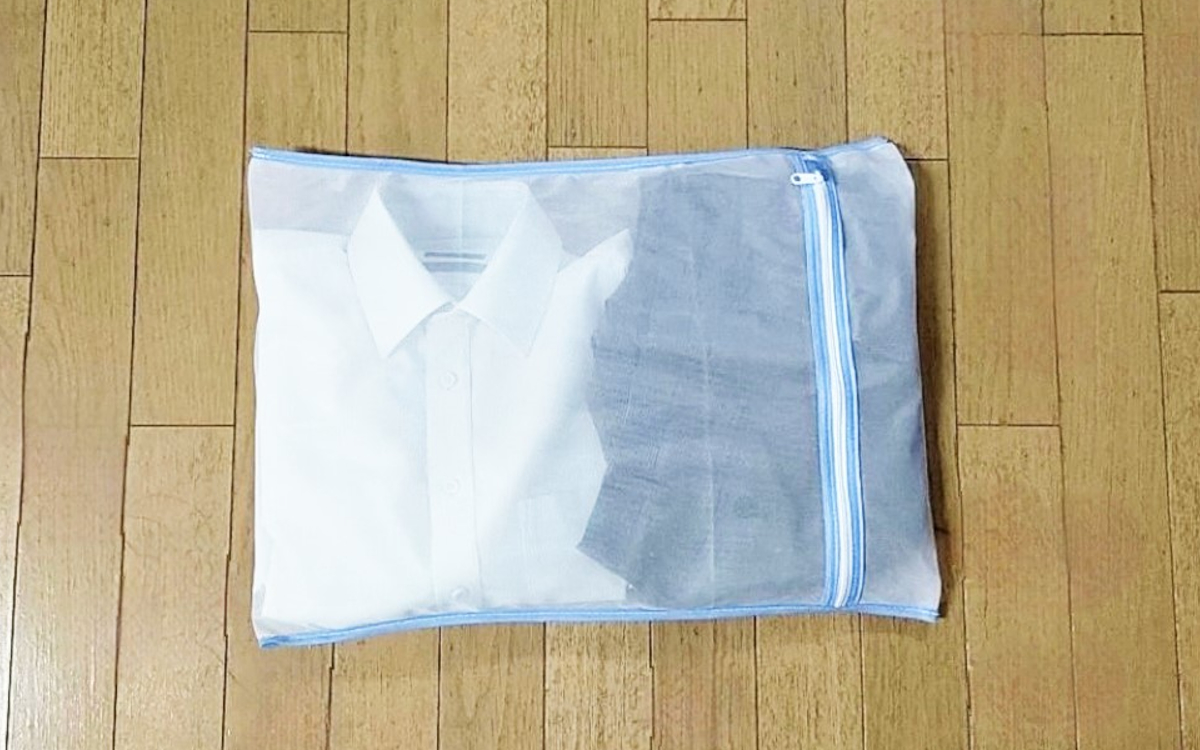 実際に紳士用のワイシャツ(長袖)と、ウォッシャブル仕様のパンツを入れてみました。セットで入れてもネット内はわりと余裕があります。あまりギュウギュウだときちんと洗えているか不安ですが良い感じですね。