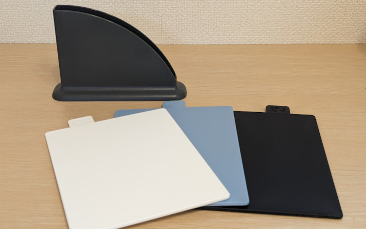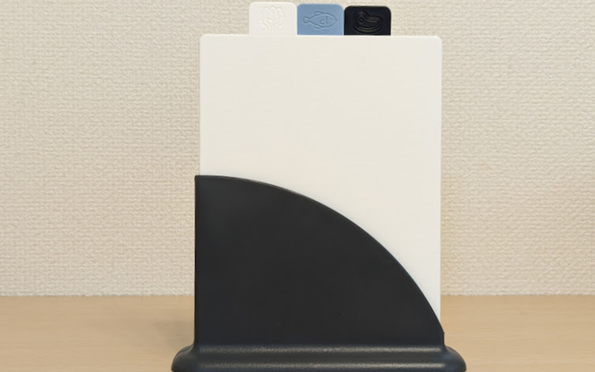 3枚のまな板だけでもお得感があるのに、さらにケースまでセットに。差し込んで立てて置けるようになっているため、バラバラにならずにコンパクトに収納できます。底部分には特にすべり止めが付いているわけではありませんが、わりと安定感がありグラついて倒れることはなさそう。