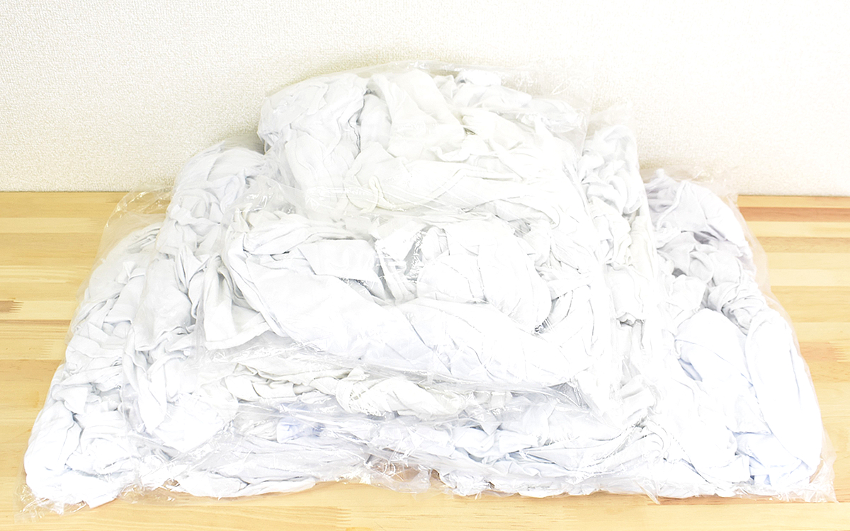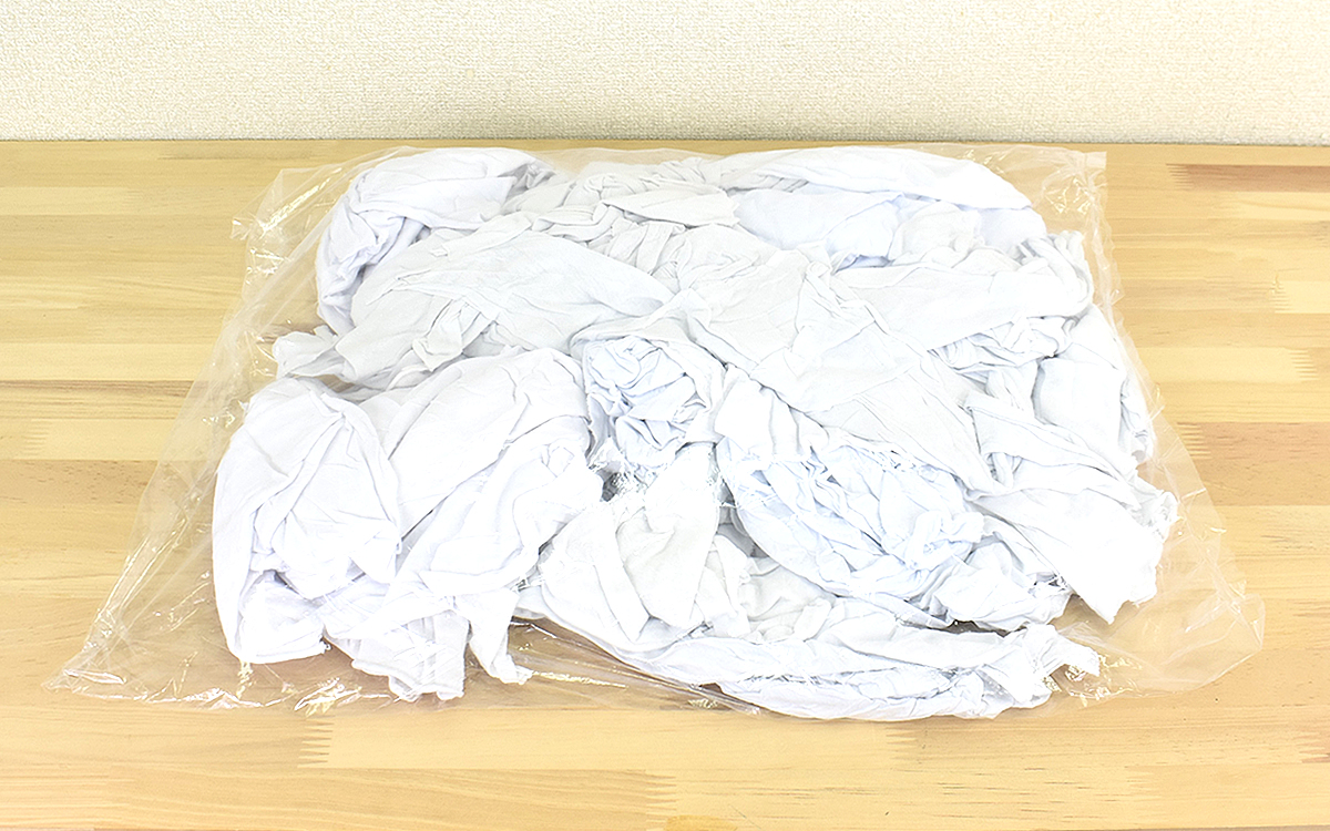 商品が手元に届いて真っ先に驚いたのは、ビニール袋にたっぷり詰まったウエスの量。今回は1束1kg×5袋タイプを選びましたが、商品公式ページではさらに大量の1束4kg×5袋タイプを注文することもできます。とはいえ1束1kgタイプでも十分な量。2849円で手に入れられるのでコスト面も安心です。