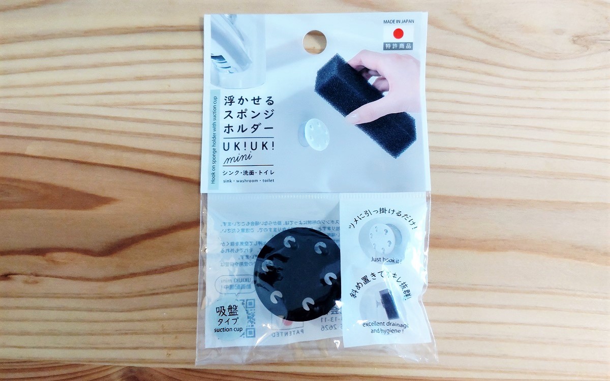 みなさん食器洗いスポンジをどこに置いていますか? シンクに備え付けられたスポンジ置き場や、フック状になっているホルダーを吸盤でシンクの中につけている人などさまざまですが、スポンジの水切れが悪いと衛生面が気になりますよね。スッキリ乾いてお手入れが楽なものを探していて見つけたのが、ダイソーの「浮かせるスポンジホルダーUKIUKImini(黒)」(110円/税込)です。