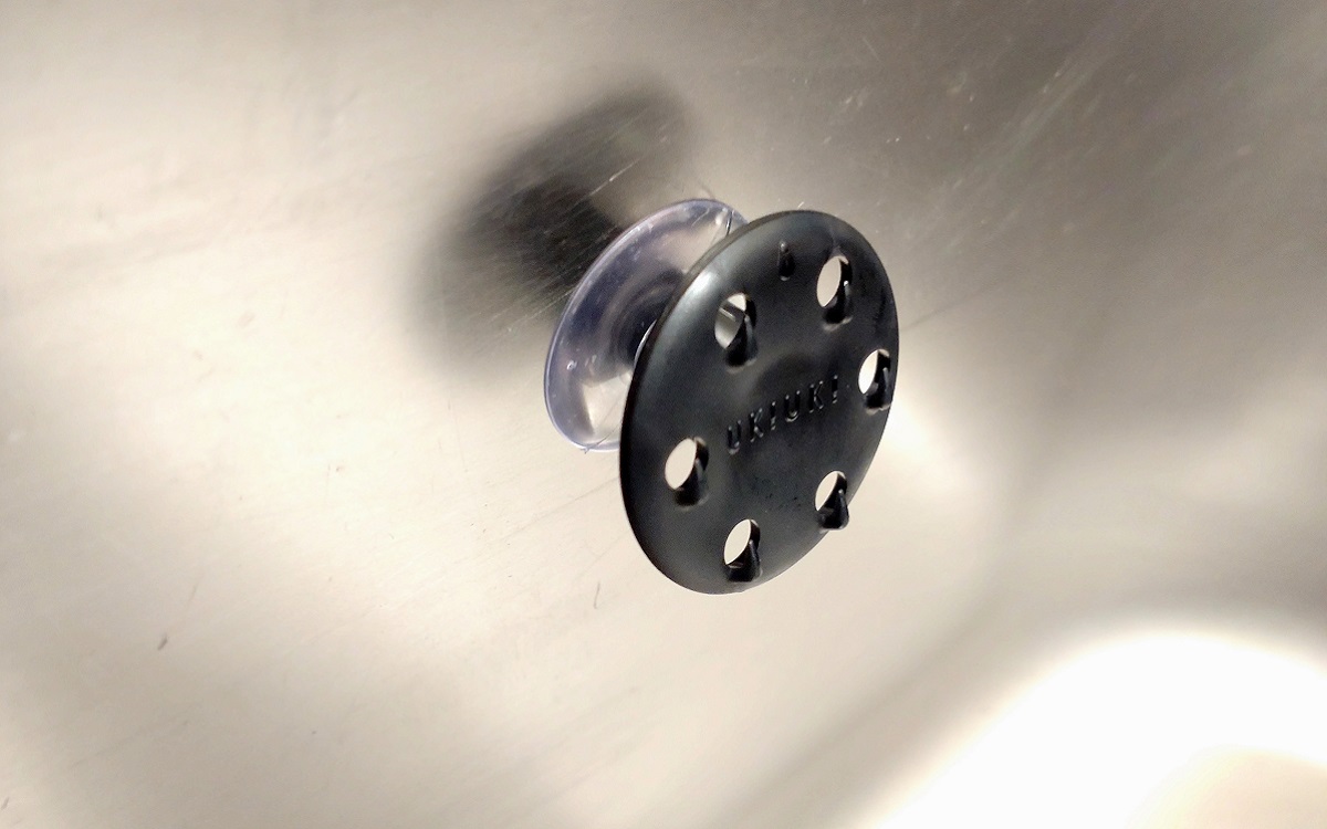 袋の中には“トゲ”の付いた黒い円盤状のパーツと吸盤が入っていました。円盤状の本体パーツは直径3.4cmとかなりのコンパクトサイズ。まずは本体パーツの裏側に、吸盤を取り付けておきましょう。吸盤をつけたらスポンジを取り付けたいところにペタッ!
