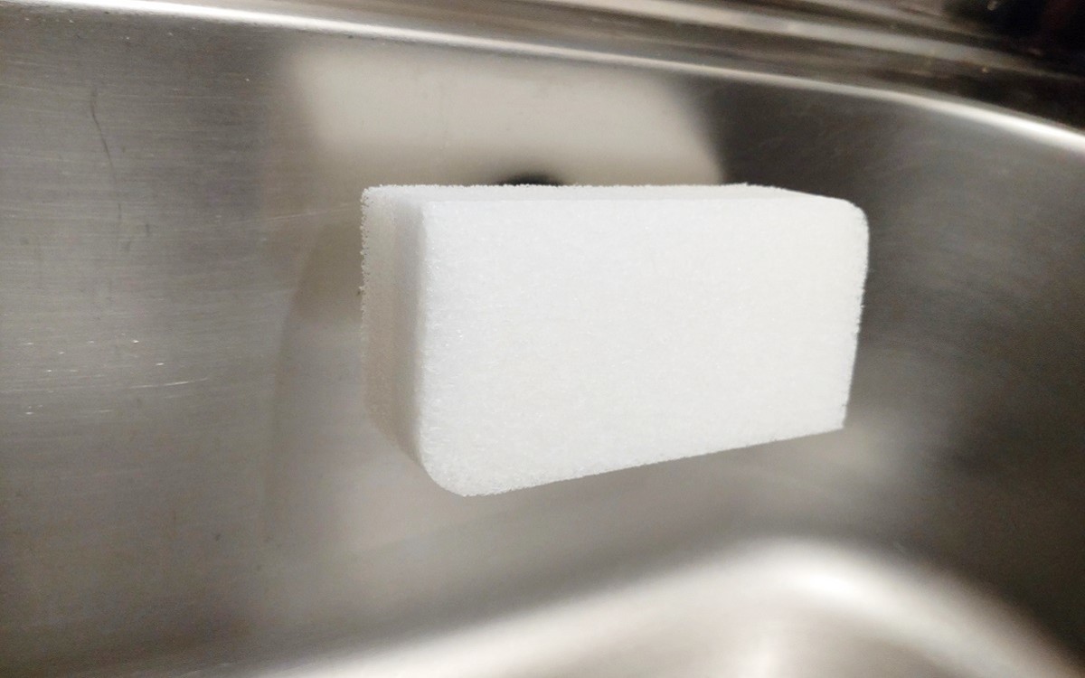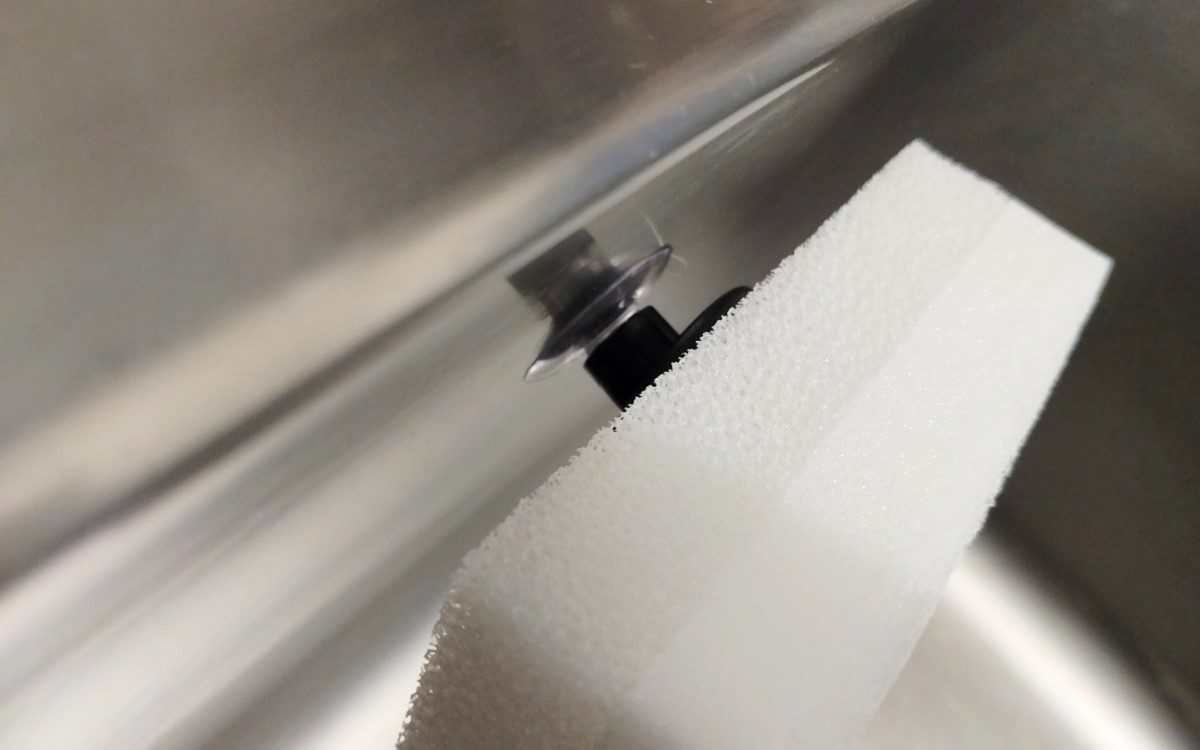 取り付けたときに、スポンジ取付面が上方へ傾いた形に。スポンジを付けてみるとちゃんと傾いて水切れがスムーズになりました! ちなみに取付面の“トゲ”がしっかりとスポンジをホールドしてくれるので、軽く乗せただけでも落ちてくる心配はありません。