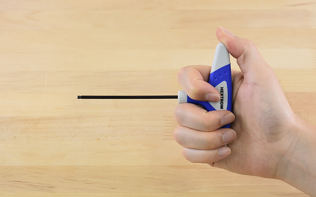 実際にハンドルを握ってみたところ、角が丸みを帯びているため手によく馴染む感じがしました。通常のL字六角レンチにはないハンドルがあることで、力が伝わりやすいだけでなく回しやすさも抜群です。