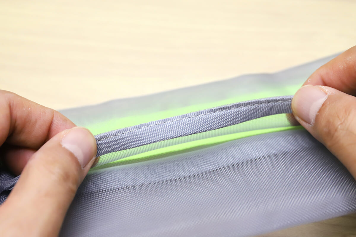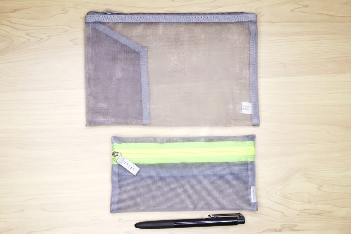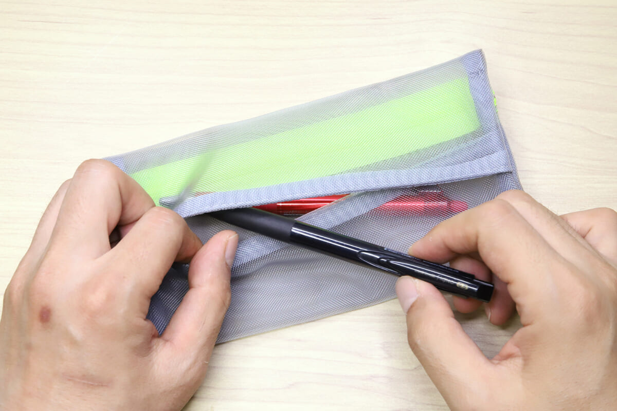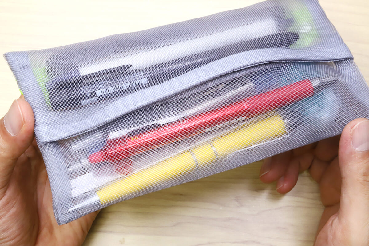 有り体に言えば “網戸” みたいなものなので、中身もそれなりに透けて見える。どのペンがどこに入っているのか? 消しゴムはどこにあるのか? 放り込んでおいたはずのUSBメモリは間違いなく入っているのか? それらがすべて、いちいちファスナーを開けてゴソゴソ探すことなく一目瞭然、というわけだ。特に忘れ物や小物の紛失が多いタイプの人には、これだけでも使うメリットが大きいのではないだろうか。
