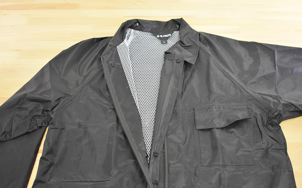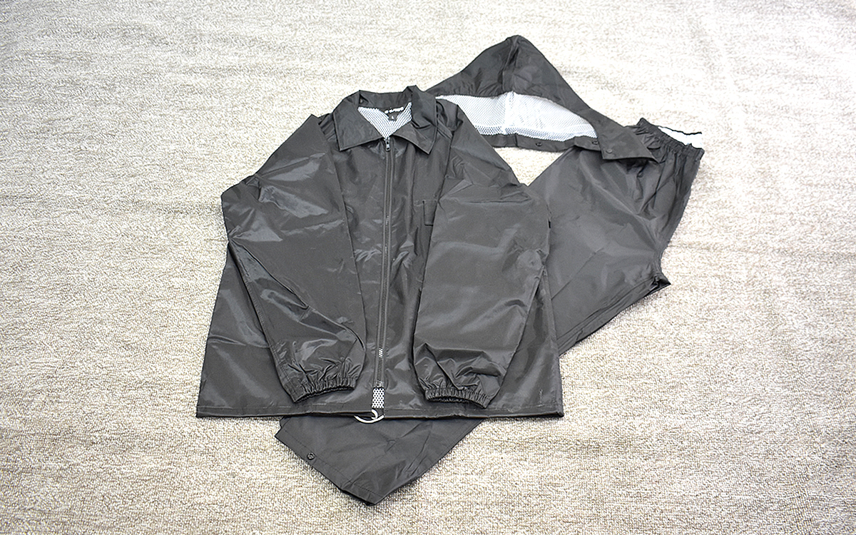 レインスーツ上下の裏側にはメッシュ生地が使われていました。蒸れにくく生地が肌につかないので、レインスーツの弱点である脱ぎにくさを解消。フードはスナップボタンで付いているので、普段は外しておいて必要時だけ付けることもできます。