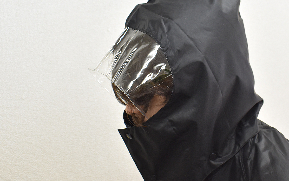 フードには首から口元までのガードがついていて、顔が濡れるのが嫌な方にオススメ。ひさし部分には透明な素材が使われているので、レインコートを着ていても視界がクリアなのがGOODです。