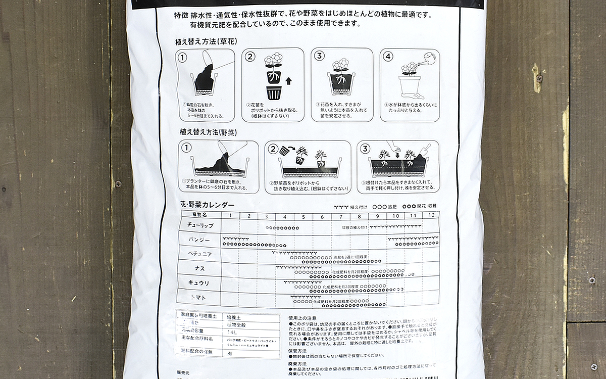 取り扱いについては袋の裏面に記載があります。草花・野菜の植え替え方法だけでなく花・野菜カレンダーも併記されているので、これからガーデニングや家庭菜園を始めようと思っている人にもうってつけの商品です。