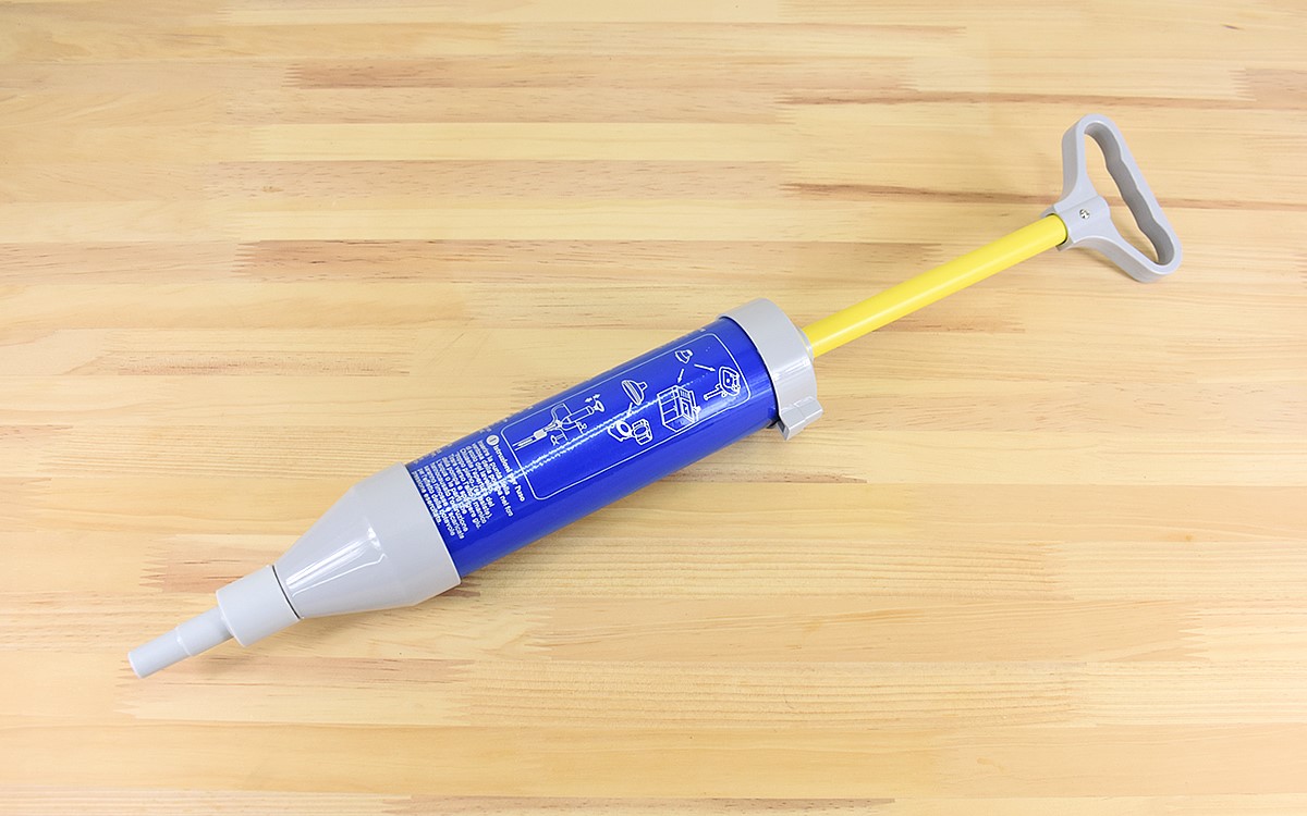 寸法は、ノズルを取り付けた状態で60(直径)×425mm(長さ)とコンパクト。本体部分にレバーがあり、押し引きすることで空気を送ったり吸ったりすることができます。本体に記載されている説明書きは英語ですが、それぞれのパーツが対応できる状況のイラストも添えられているので分かりやすいですよ。