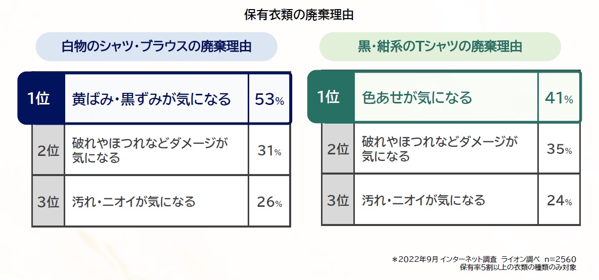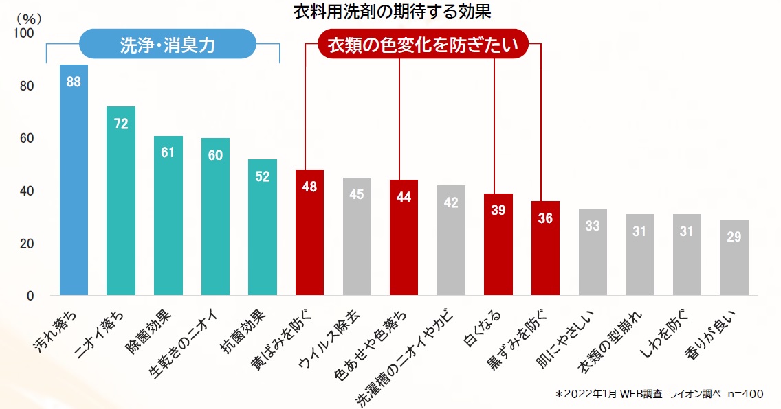 洗剤の基本価値は、洗浄力である。実際、同社調べの「衣類用洗剤に期待する効果」でも、トップが「汚れ落ち」で、次点には「ニオイ落ち」と続く。一方、同調査からは「黄ばみを防ぐ」「色あせや色落ち」など、衣類の色落ち防止へのニーズも高いことも分かっている。