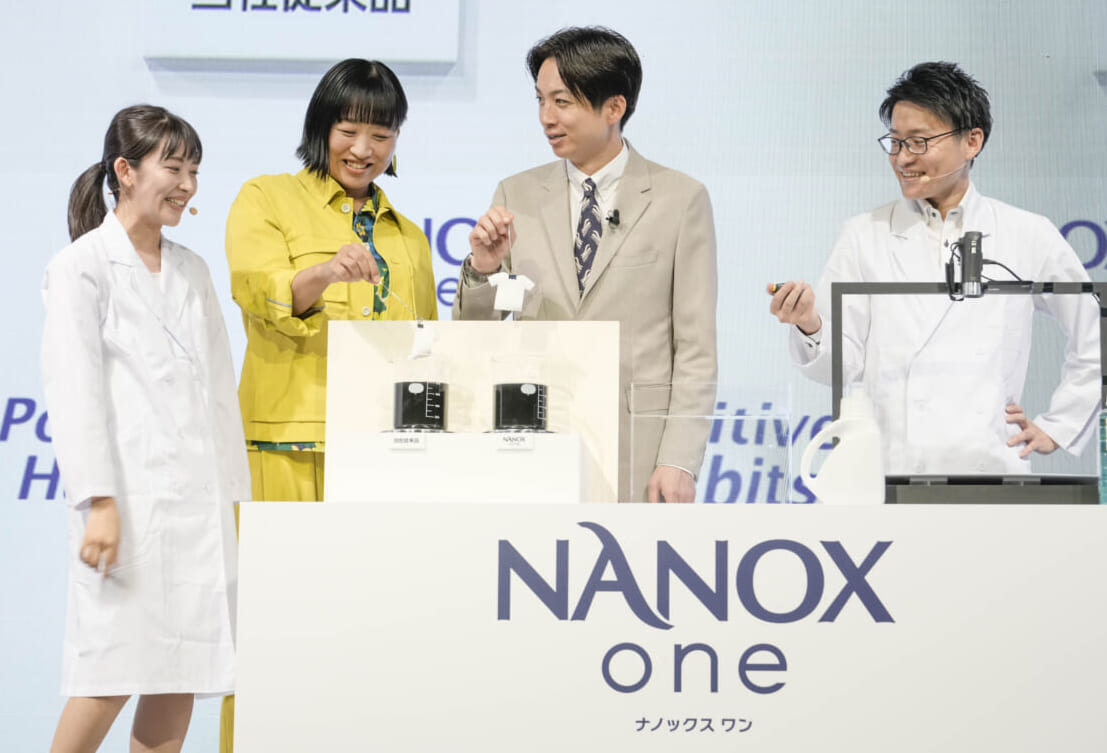 さて、「ナノックス ワン」の特徴は、前述の通り「高い洗浄力・消臭力」と「衣類の色を保つ機能」である。同発表会では、お笑いコンビ・南海キャンディーズの山崎静代さんと、アインシュタインの稲田直樹さん、河井ゆずるさんが登壇。洗濯やファッションについてのトークの後、「ナノックス ワン」と従来製品の比較実験に参加した。