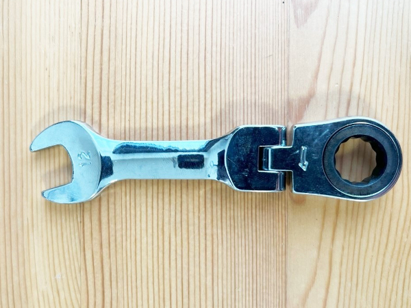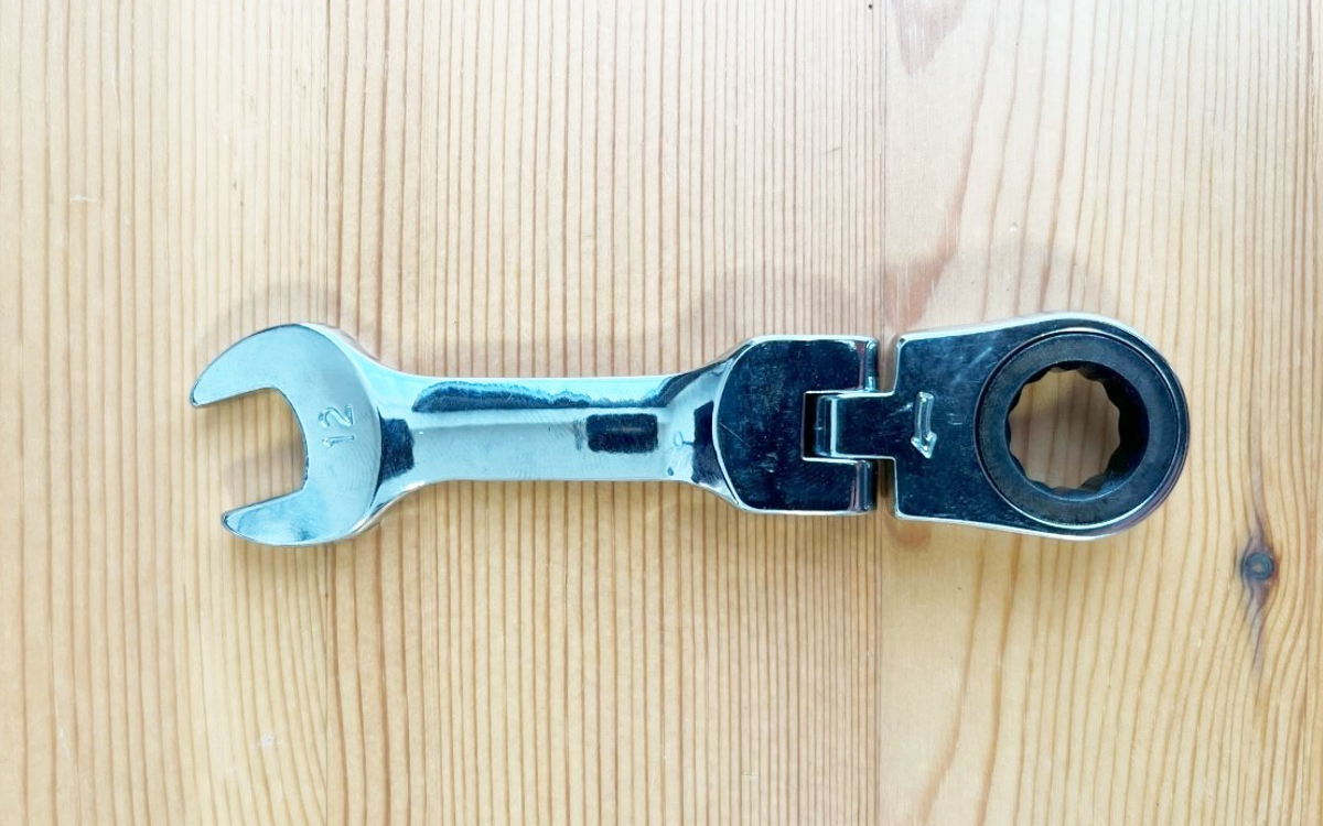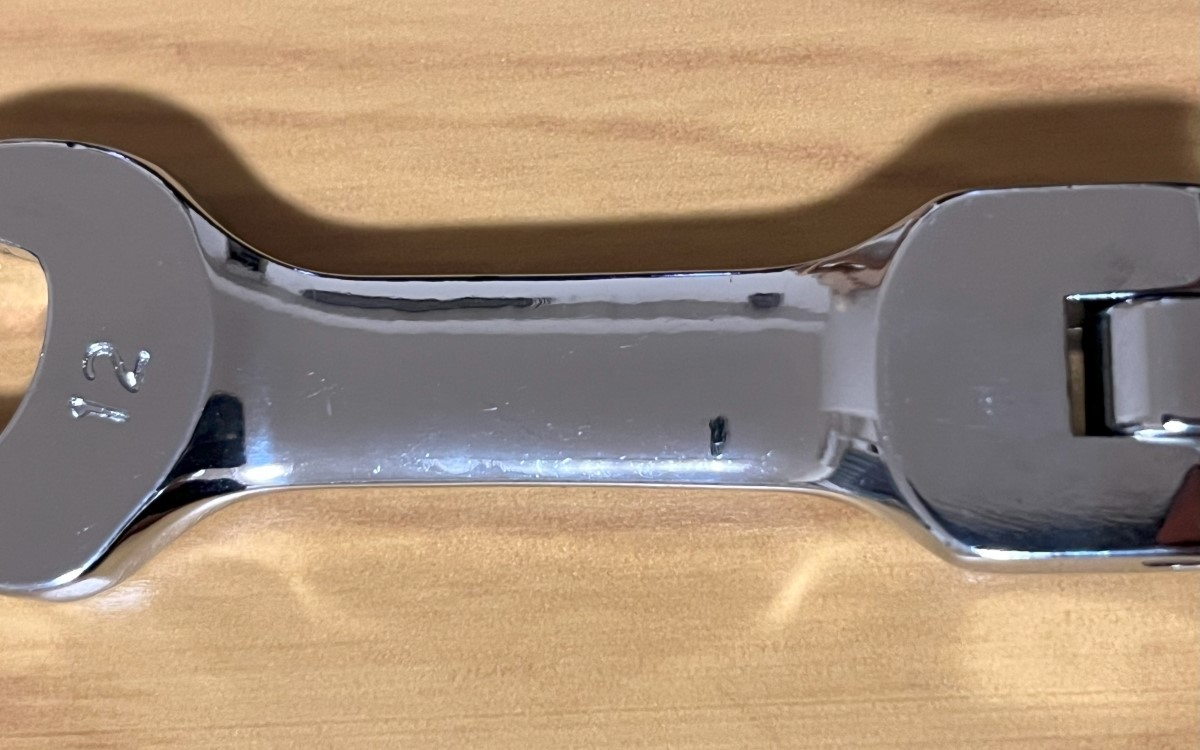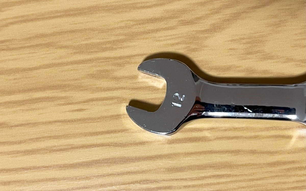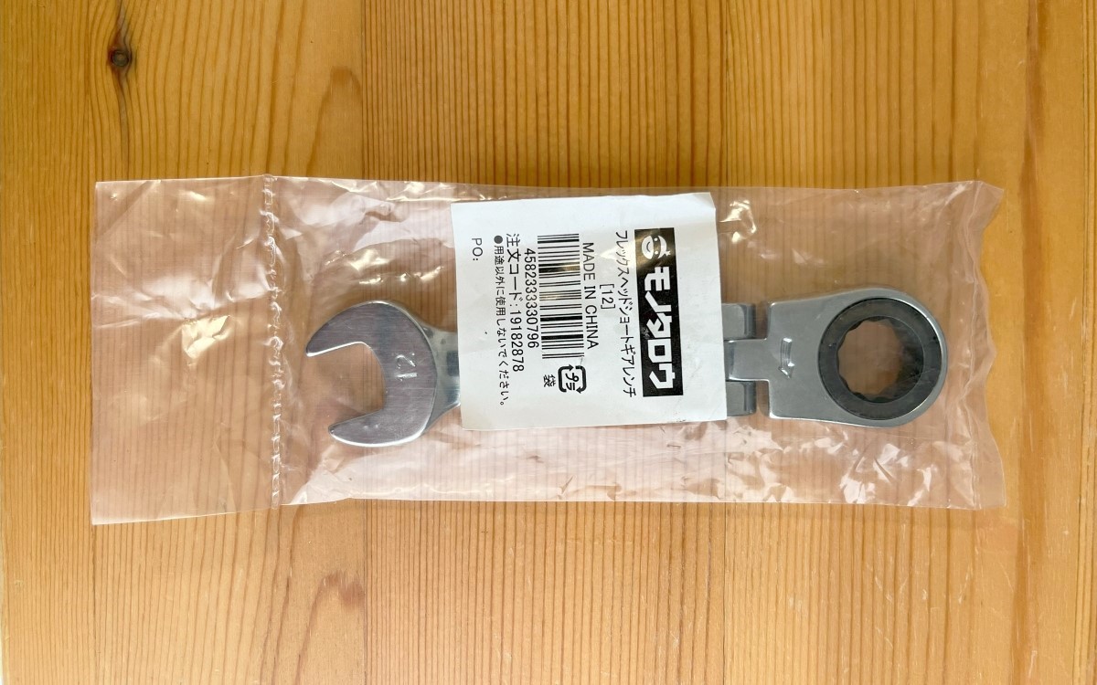 ギアレンチは車両整備をするときに欠かせない工具です。今回購入した「ギアレンチ ショート フレックスヘッド」(1088円/税込)は、全長111mm、重さ83gと手にしっくりと馴染むサイズ。寸法は12mm、歯数72となっています。