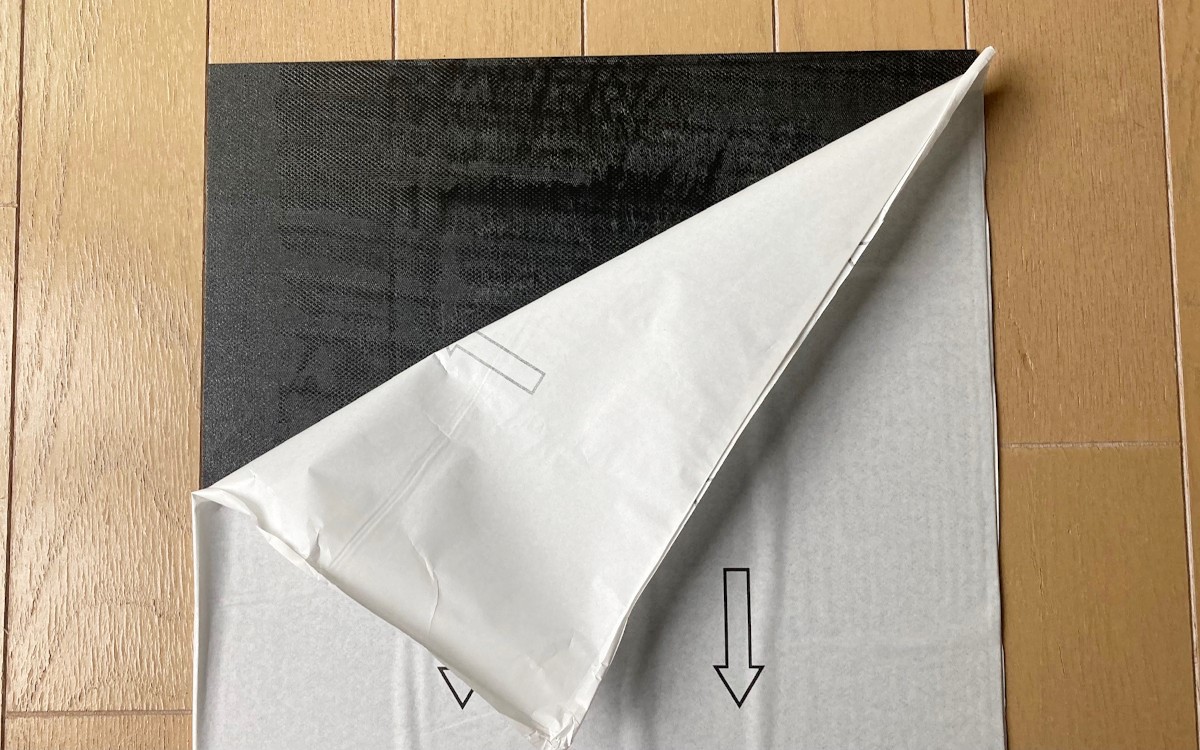マットを裏返すとはく離紙がついており、剥がす方向も矢印で示されています。はく離紙の方が大きめにカットされているので、指でつかみやすく難なく剥がすことができました。はく離紙をめくると本体裏側は黒色です。