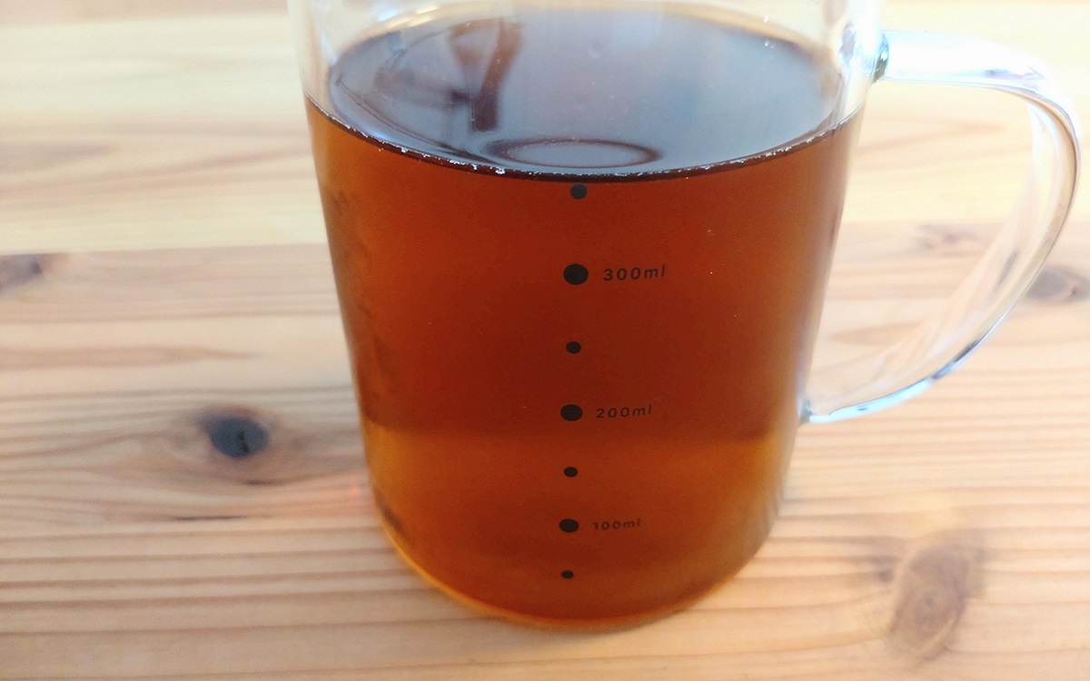 本商品にまず惹かれたのは、この絶妙なサイズ感。取っ手を除くサイズが高さ約10.5×幅約9×奥行き約8cmと、ちょうどよい大きさです。ちなみにすべて手作りのため、商品によって多少サイズは異なるとのこと。あまり大きすぎないサイズのものを探すと200mlや250mlが多く少し物足りないのですが、こちらは容量350mlまで計測できます。