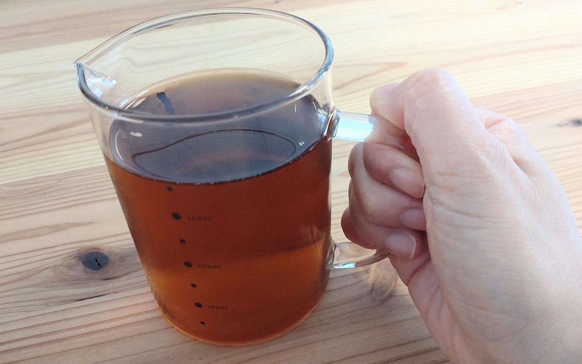 取っ手のカーブが緩やかで、手にフィットするのもポイント。液体を入れると重くなるので、持ちやすいのは重要です。注ぎ口もしっかりと作られていて、試しに注いでみてもほとんど液垂れしませんでした。
