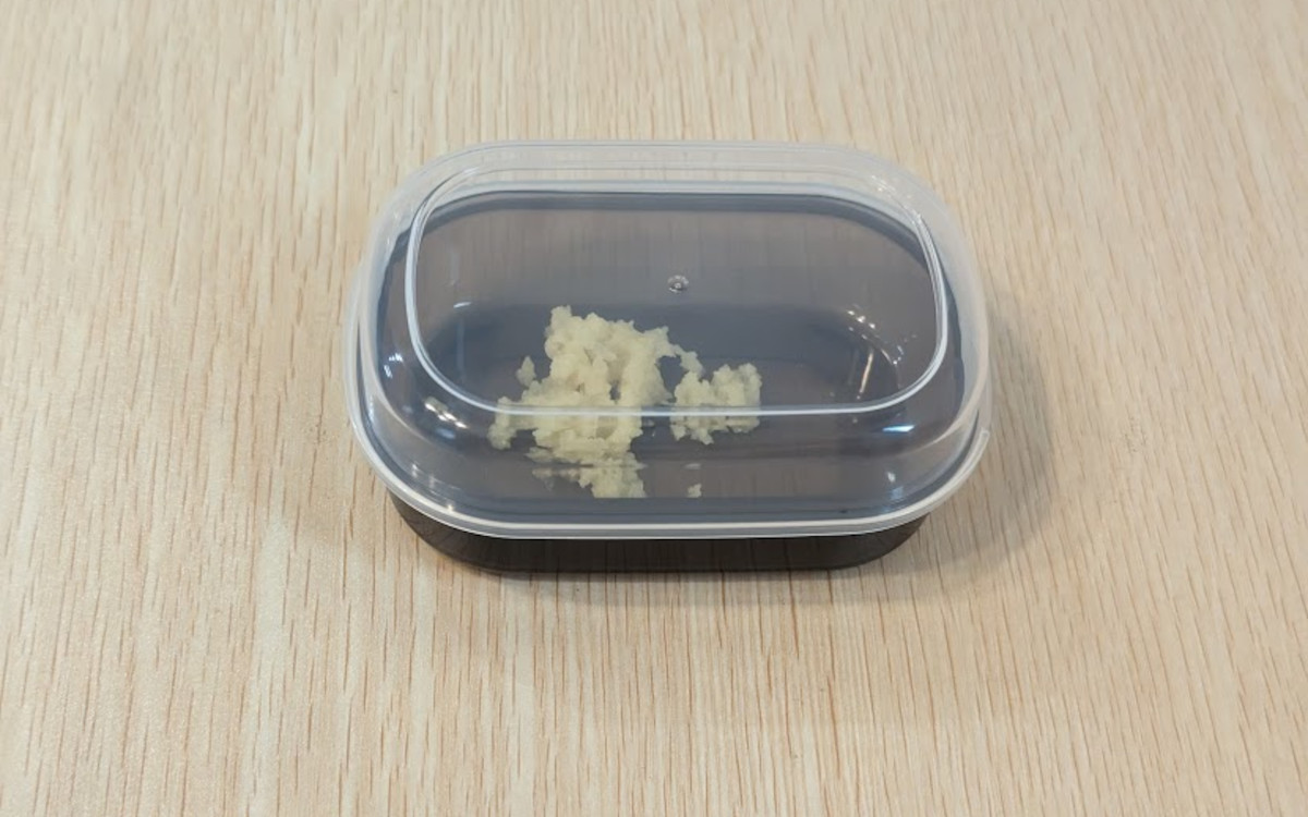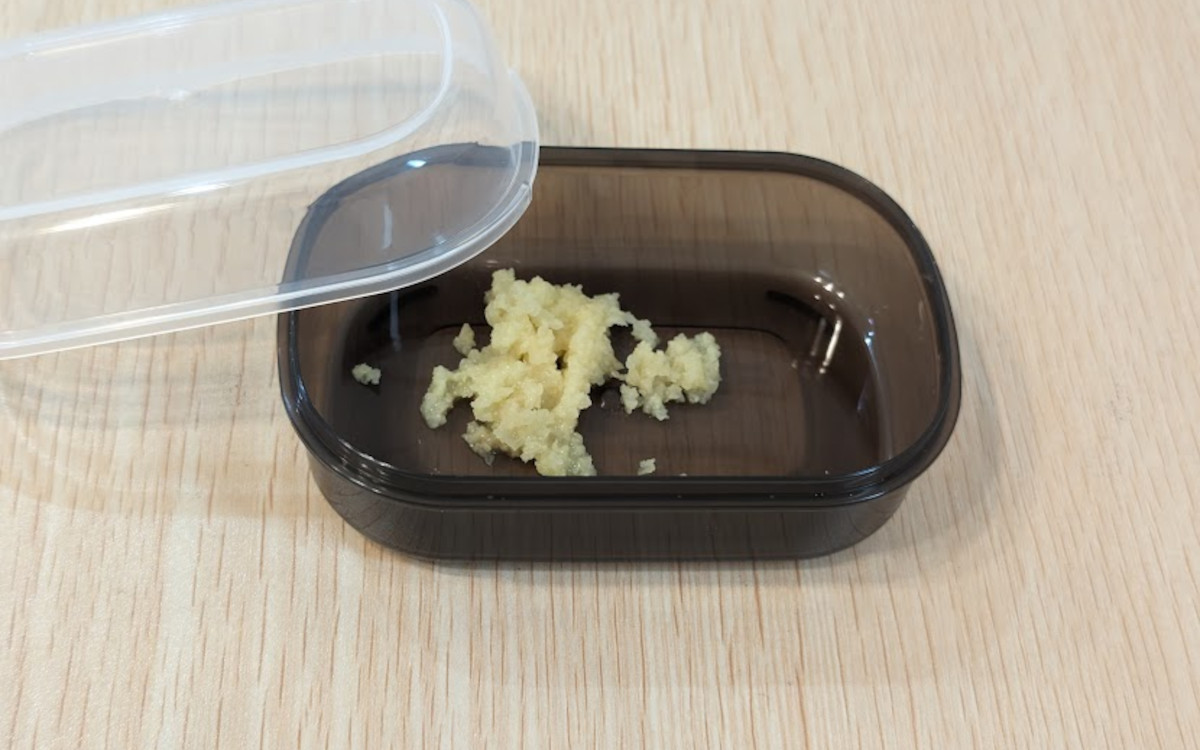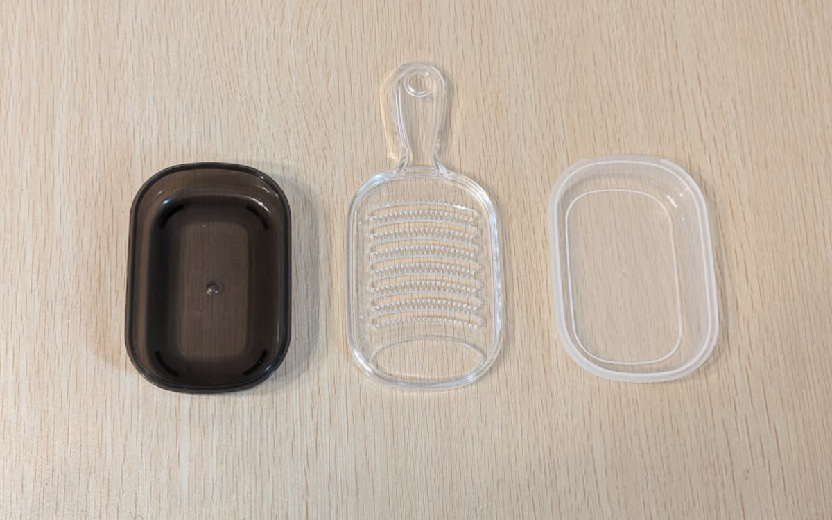 おろし板にフタと容器もついて、3点セットになっていました。大きさは3点セットを重ねた状態でおよそ幅7.8cm×奥行16.8cm×高さ5.4cmと、一般的なおろし板に比べると小さいサイズです。