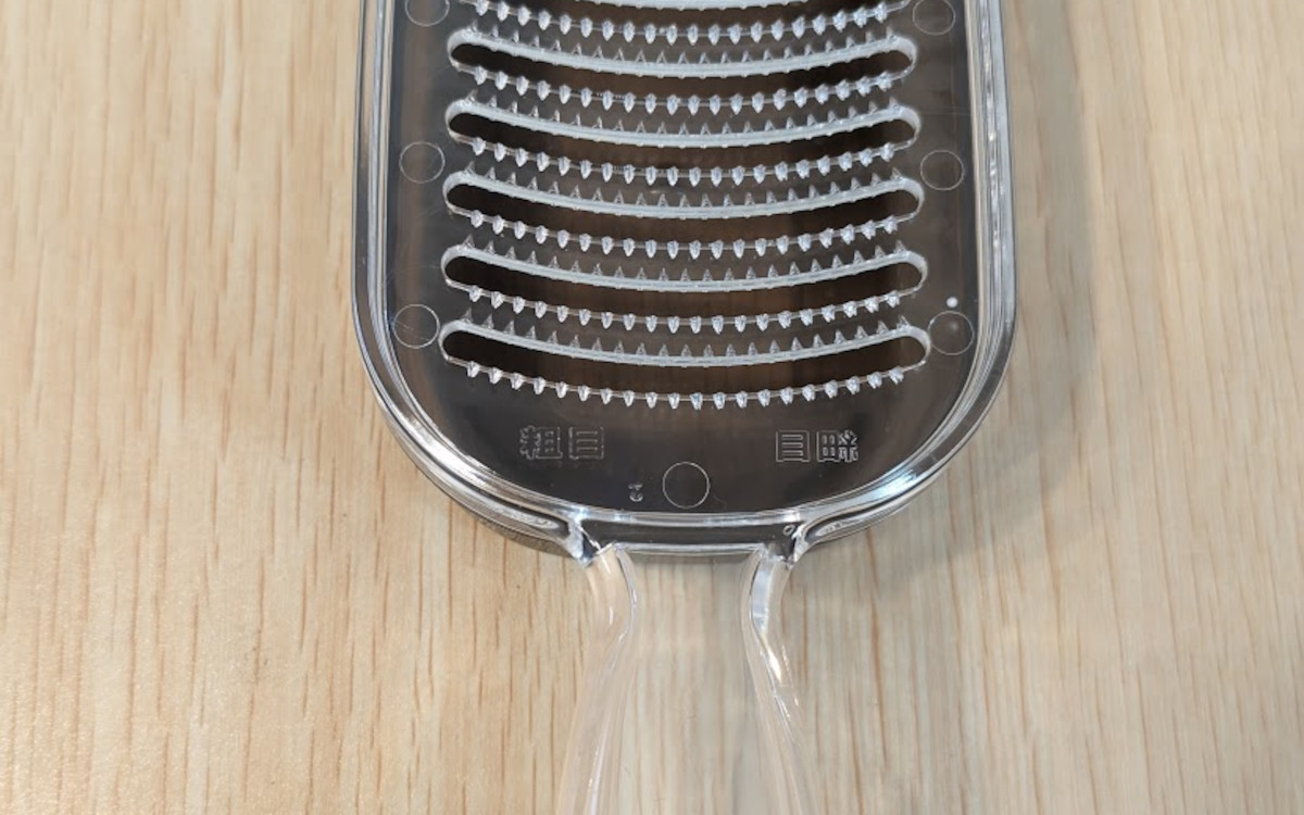 穴が横長に大きくあいているおかげで、おろしている最中に繊維が詰まりにくい設計です。洗う時にも水で流すだけで、繊維が引っかかることなくサッとキレイに取れました。