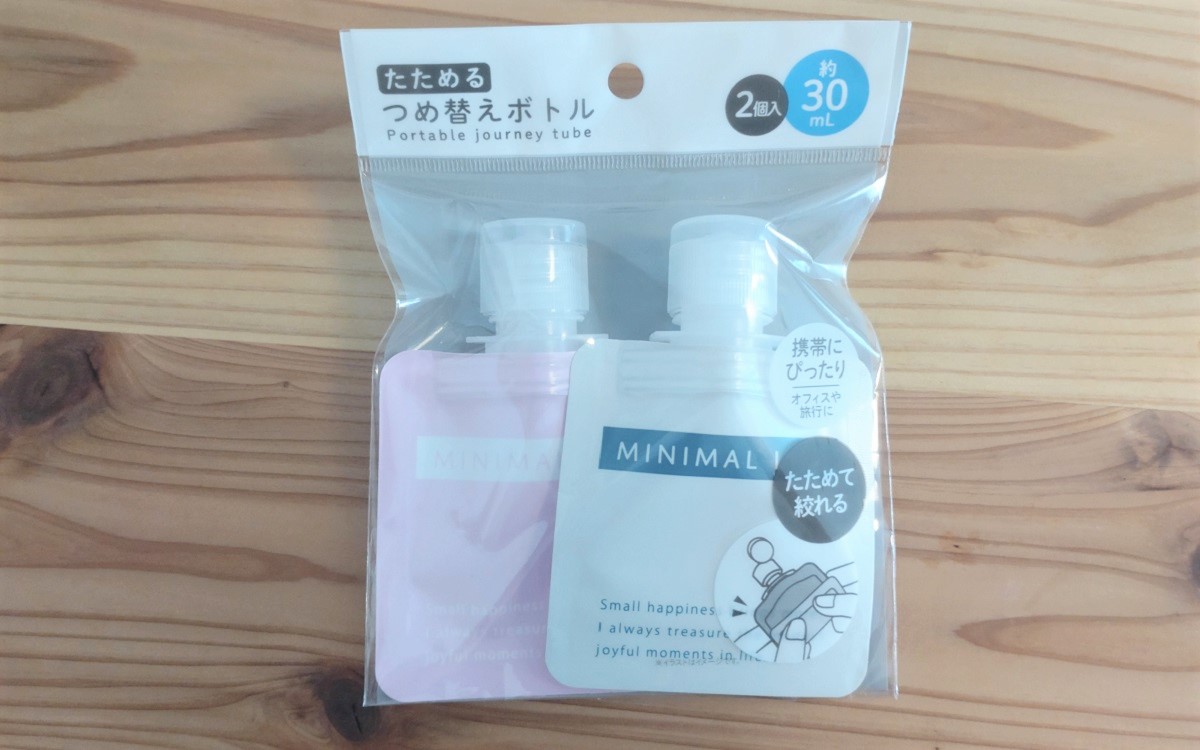 ●コンパクトサイズでポーチの中でも邪魔にならない「たためる詰め替えボトル 30ML 2個入り」(ダイソー)
