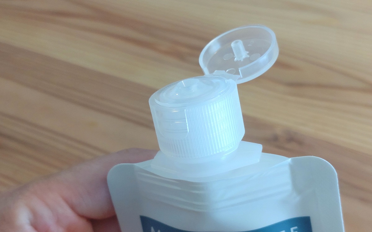 液体を入れ終わったら、しっかりとキャップを締めましょう。そしてキャップ上部の蓋を開ければ、少量ずつ出てくる口が出現! サラサラの液体だと多めに出てしまいますが、乳液やハンドクリームのような粘度のあるものだと本体を握ることで量の調節ができます。