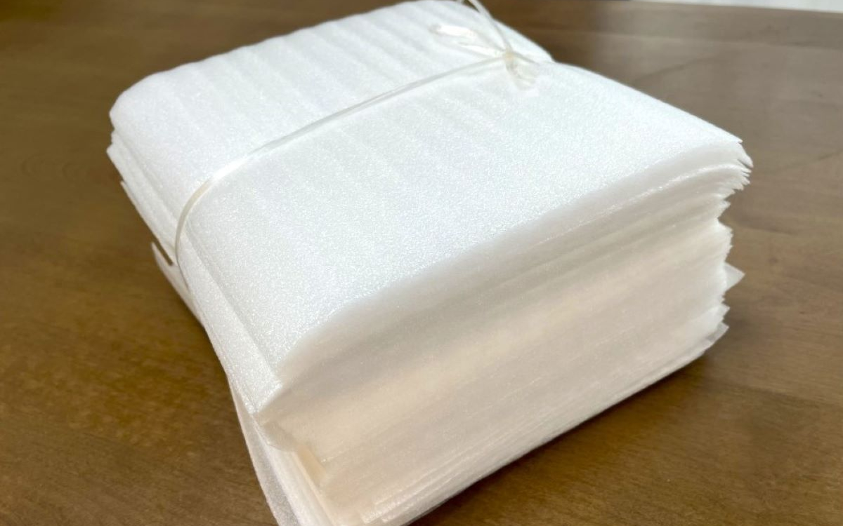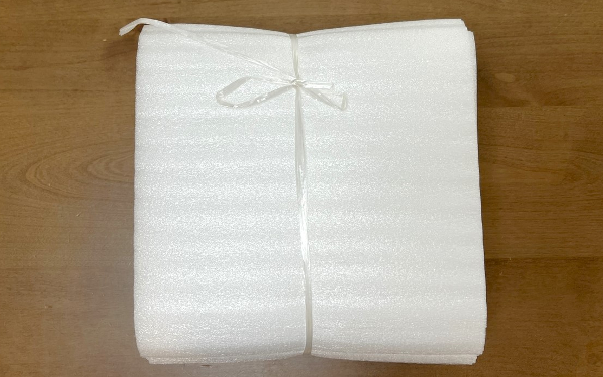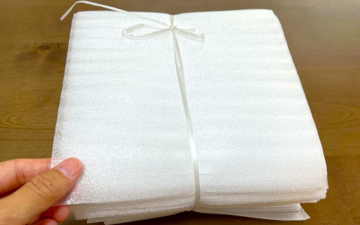 今回購入したのは、縦約200mm、横約200mm、厚さ約1mmの大きさのもの。1束で100枚入っているので、梱包に失敗しても気にせずに何枚でも使えます。今回は縦横200mmのタイプを購入しましたが、縦横300mmタイプもありサイズが選べる点も好印象ですね。