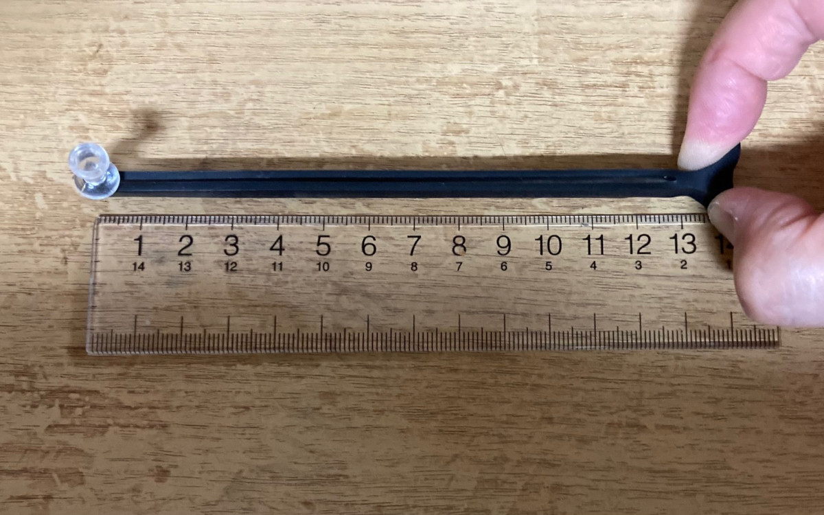 全長は8センチほどですが、輪っか部分は7センチほど。伸ばすと輪っか部分が13cm弱になりました。説明書には「最初の長さの180%になる」とありますが、先端部分を入れると確かに14センチほどになります。